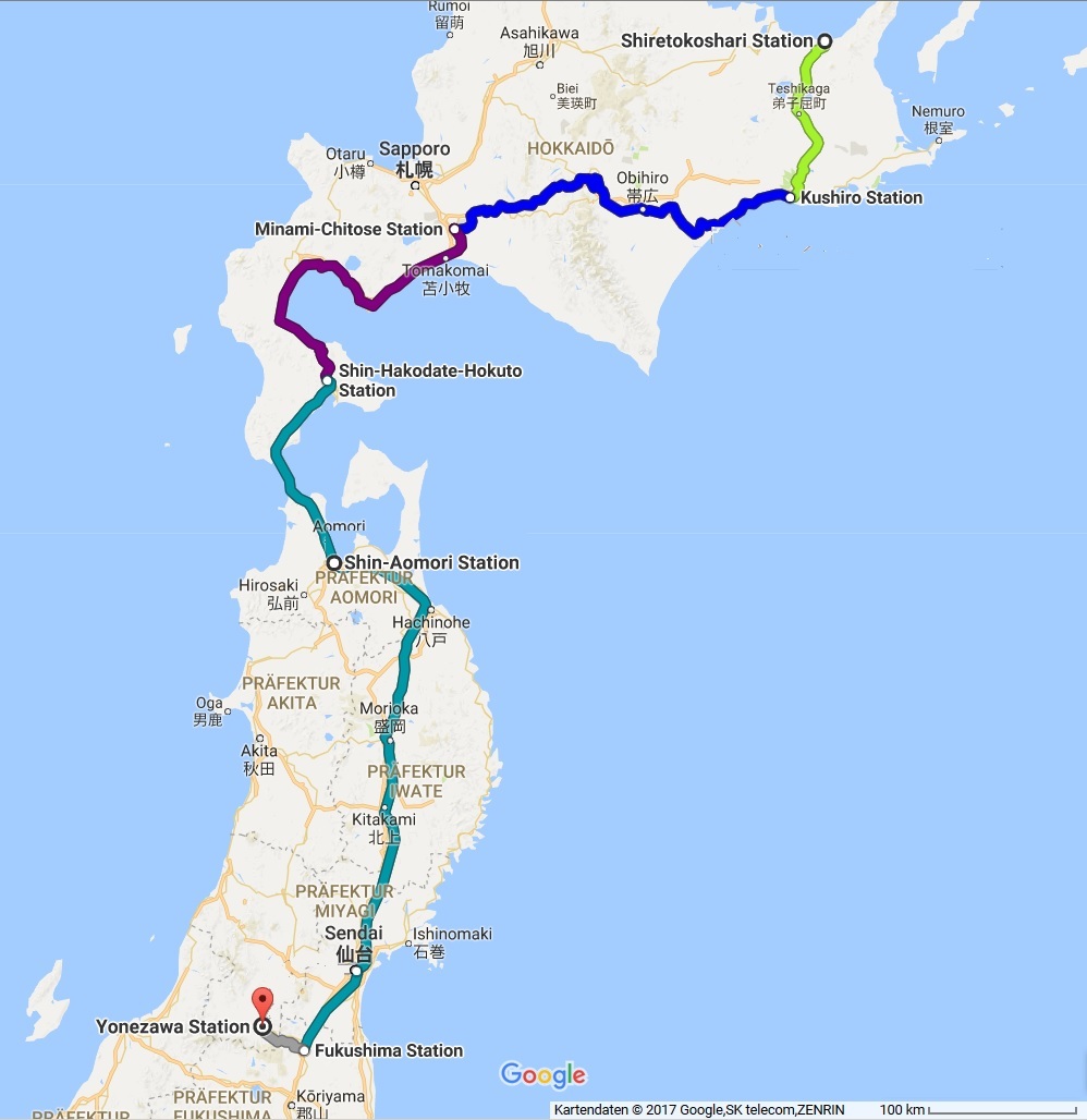 Nach Kushiro mit der JR Senmo Line stehen vormittags gerade mal zwei Züge zur Auswahl: 07:26 oder 11:17, der nächste fährt dann um 15:58 und zwei weitere folgen abends. Gepackt und verpflegt um 07:26 losfahren, das war mir zu hektisch, also musste es der 11:17 sein, der Kushiro fahrplanmäßig um 13:33 erreicht. Von dort weg gibt es Limited Express Verbindungen bis zum insgesamt 693 Kilometer entfernten Shinkansen-Bahnhof Shin-Hakodate-Hokuto. Mit dem Shinkansen geht es dann durch den Seikan Tunnel nach Shin-Aomori und weiter bis Fukushima, wo der Yamagata-Shinkansen nach Yonezawa abzweigt. Die Endpunkte meiner Fahrt trennen stolze 1322,9 Kilometer.