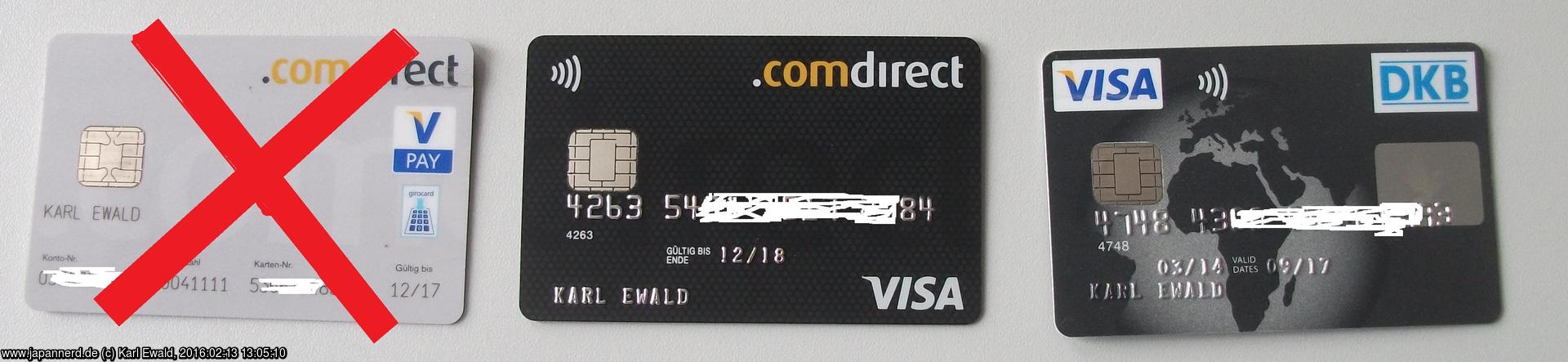 Ich besitze VISA-Karten von zwei Banken, nämlich von der comdirect und der DKB. Beide erlauben mir kostenlose Abhebungen von Bargeld im Ausland. Die DKB erstattet sogar Gebühren, die die Geldautomatenbetreiber vor Ort erheben, aber das ist in Japan kein Thema. Bei der Nutzung zum Bezahlen fällt bei beiden ein Aufschlag von 1,75% an, es ist also günstiger, Bargeld abzuheben und damit dann zu bezahlen, als mit Karte zu bezahlen.