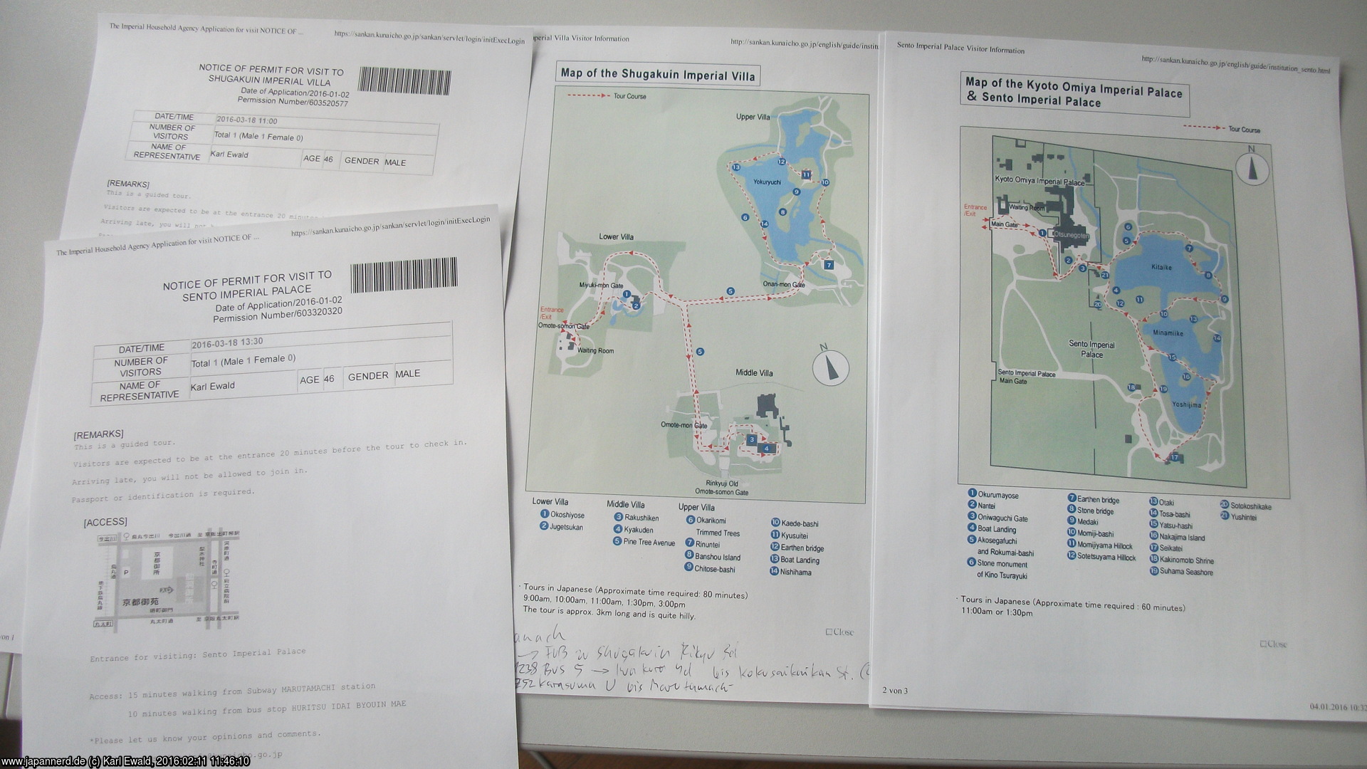 Da ich am 19.-20.03. das Sagicho Festival in Omihachiman besuchen will, ist absehbar, dass ich vorher und nachher in Kyoto vorbeikomme. Und in Kyoto gibt es neben dem dortigen Kaiserpalast, den ich schon 2013 besucht habe, drei kleinere Orte, für die man bei der Imperial Household Agency eine Besuchsgenehmigung beantragen muss, nämlich: