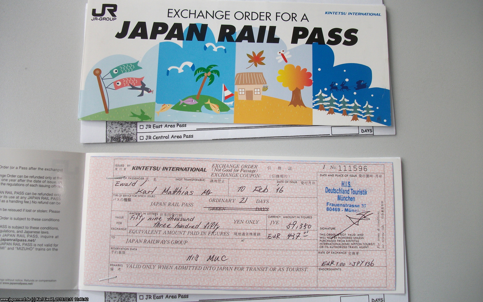 Am Mittwoch habe ich mir bei H.I.S. in München zwei Japan Rail Pass Exchange Orders gekauft.