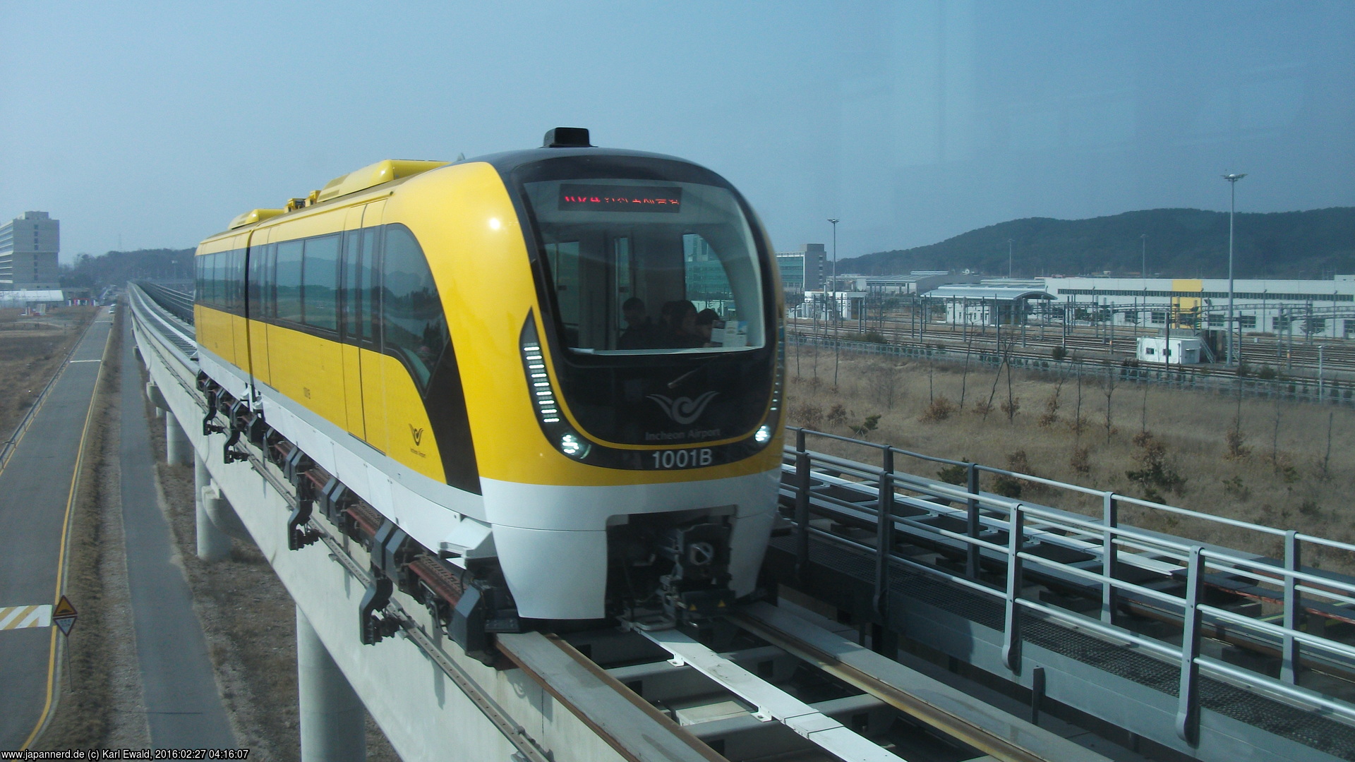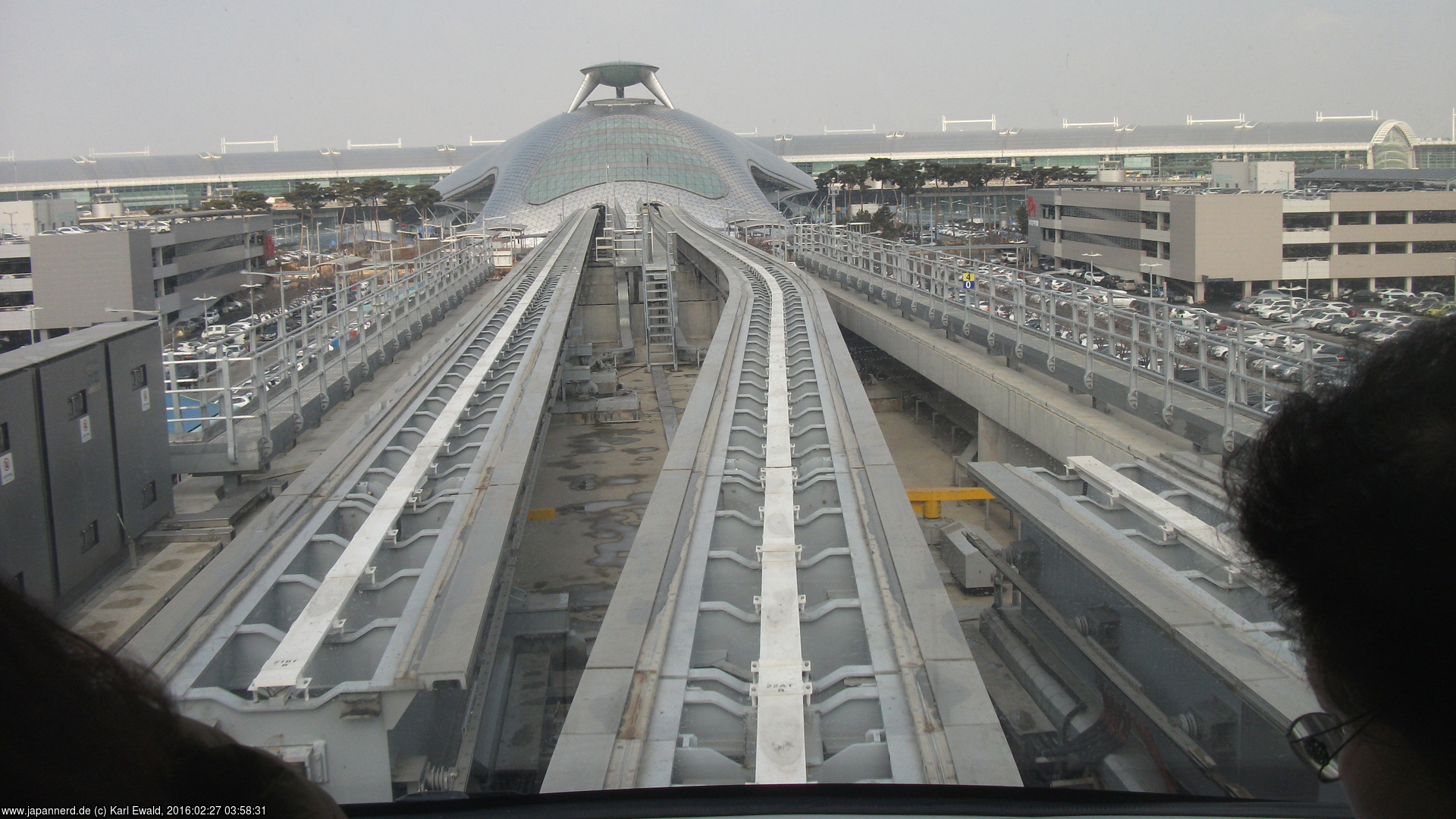 Bevor ich Richtung Seoul weiterfuhr, wollte ich noch eine Neuheit betrachten: seit einigen Wochen ist eine zunächst nur wenige Kilometer kurze Nahverkehrs-Magnetschwebebahn in Betrieb, die den Flughafen Incheon mit dem Langzeitparkplatz, einem Businesscenter, Verwaltung und einigen anderen Zielen auf der künstlichen stark vergrößerten Flughafeninsel verbindet.