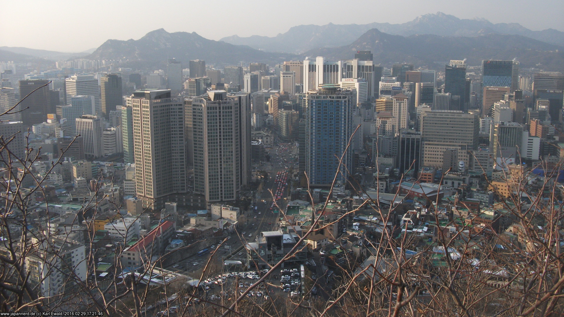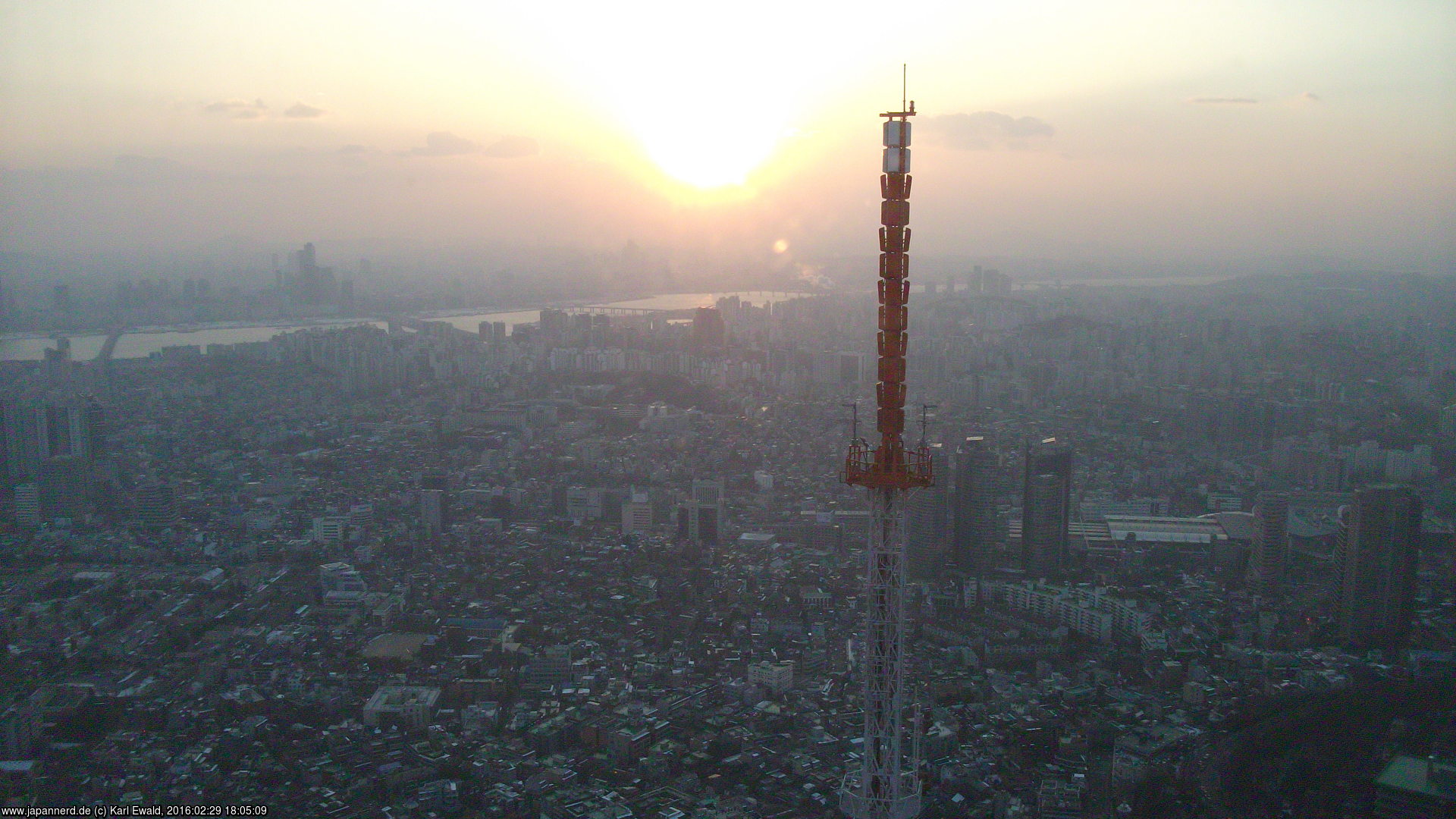 Oben gibt es 5 Stockwerke, wobei T1F, T4F und T5F Restaurants sind, so dass T2F und das Ankunftsstockwerk T3F den Ausblicksuchenden zur Verfügung stehen. Hier ein Blick Richtung Südosten, denke ich. Der Hangang Fluss umfließt den Namsan Berg ein wenig, und jenseits des Flusses ist “Gangnam” = “Fluss-Südseite”.