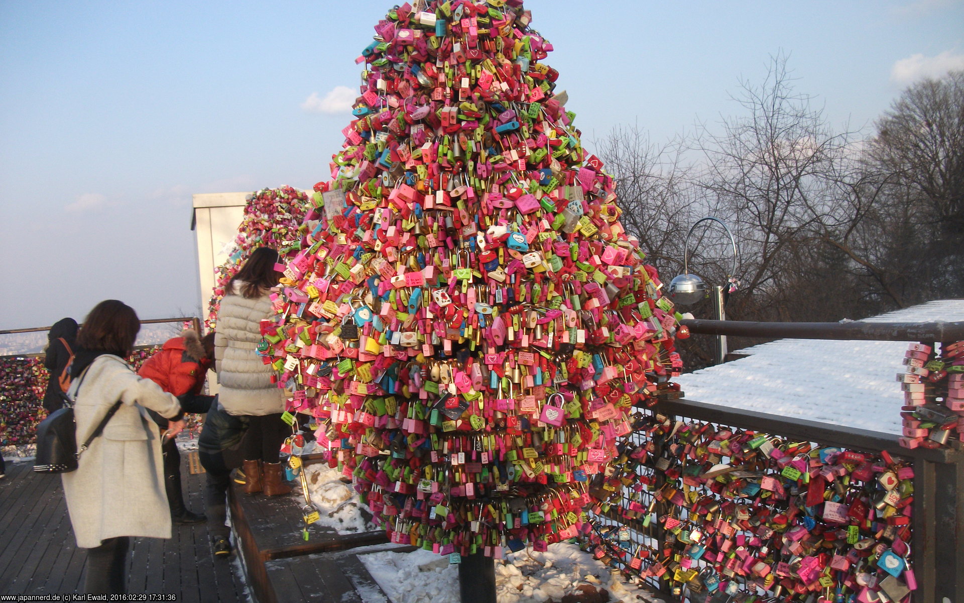 Hier ist ein beliebter Punkt, an dem junge Paare sich mit Lovelocks verewigen. Praktischerweise ist daneben gleich ein Verkaufsstand für diese speziellen Vorhängeschlösser. Außerdem wurden extra “Aufhängbäume” aufgestellt, weil die Gitter allein nicht reichen würden: