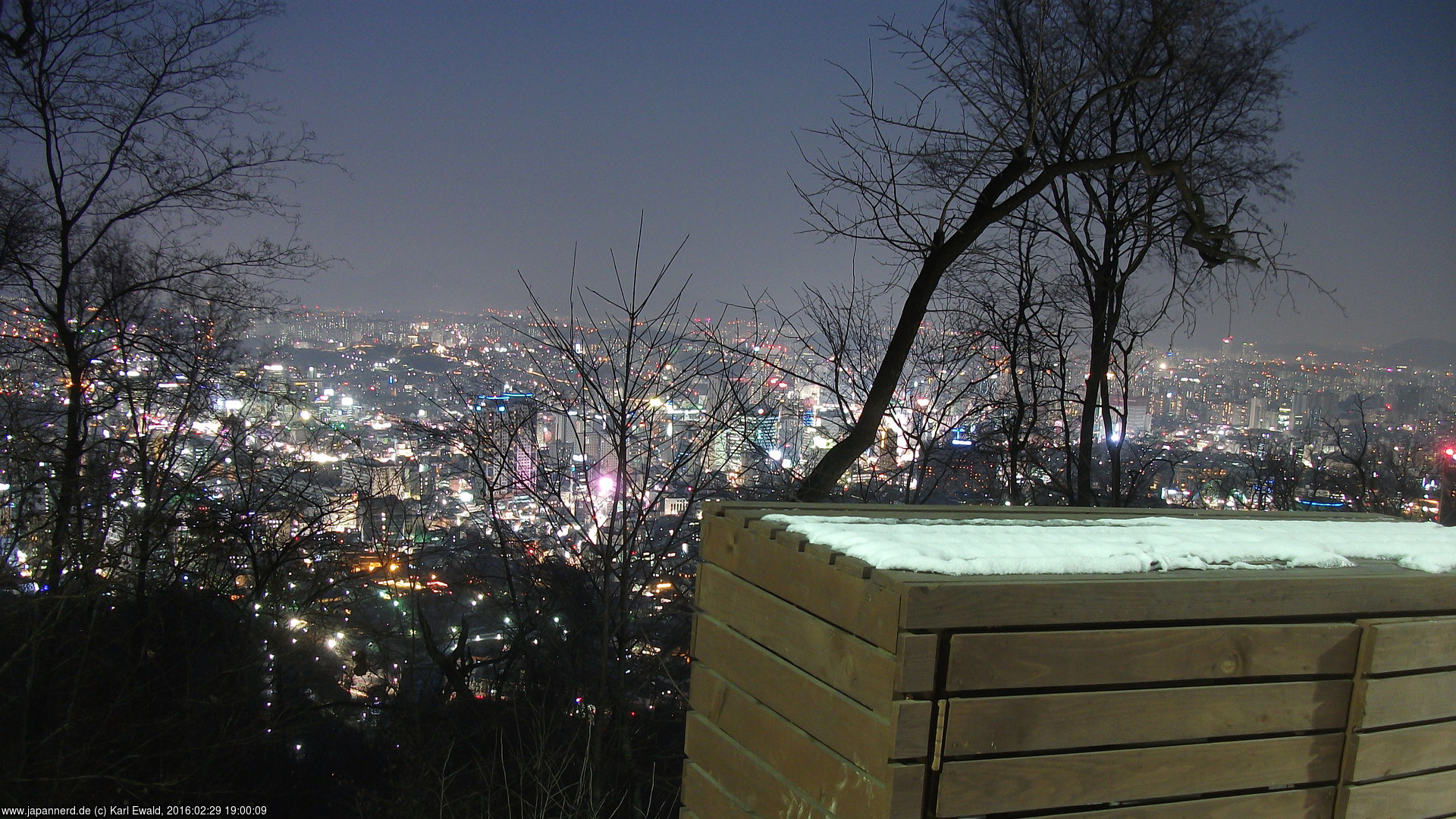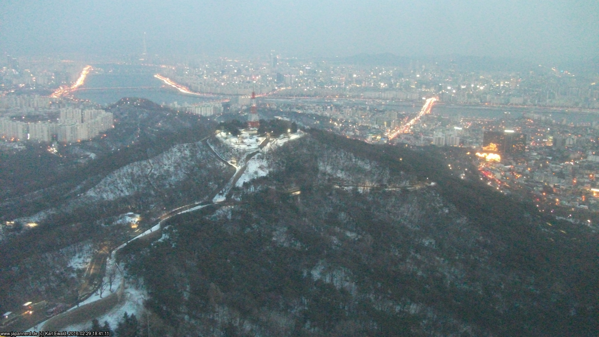 Okay, ich habe den Nacht-Langbelichtungsmodus der Kamera gefunden, es hilft ein wenig. Seoul bei Nacht, hübsch finde ich die Lichterkette entlang des Bergkamms in der Mitte.