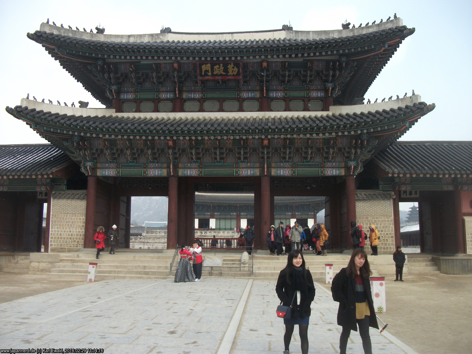 Der ganze Palast ist von einer Mauer und einem Graben umgeben, daran entlangspazierend kam ich gegen 11 Uhr am eindrucksvollen Haupttor Gwanghwamun an. Sein unterer Teil des Tores ist Teil der Palastmauer und folglich aus Stein, mit drei Durchgängen. Darüber ist in Holz mit zwei ausladenden Dächern das Torwächterhaus draufgesetzt: