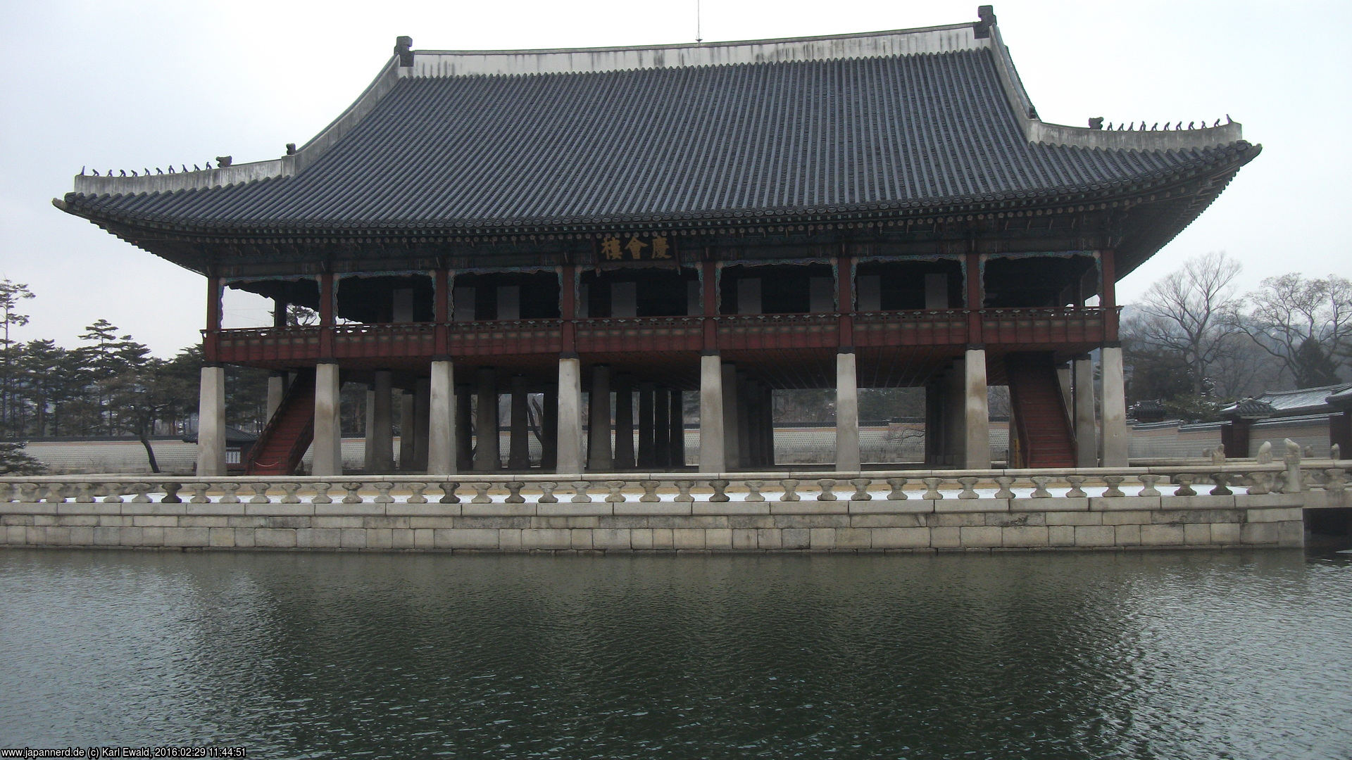 links hinter den Hauptgebäuden des Palasts befindet sich ein auf Säulen ruhender Pavillion Gyeunghoeru mit einem künstlichen See drumrum, auf dem man die Staatsgäste auch auf Booten unterhalten konnte.