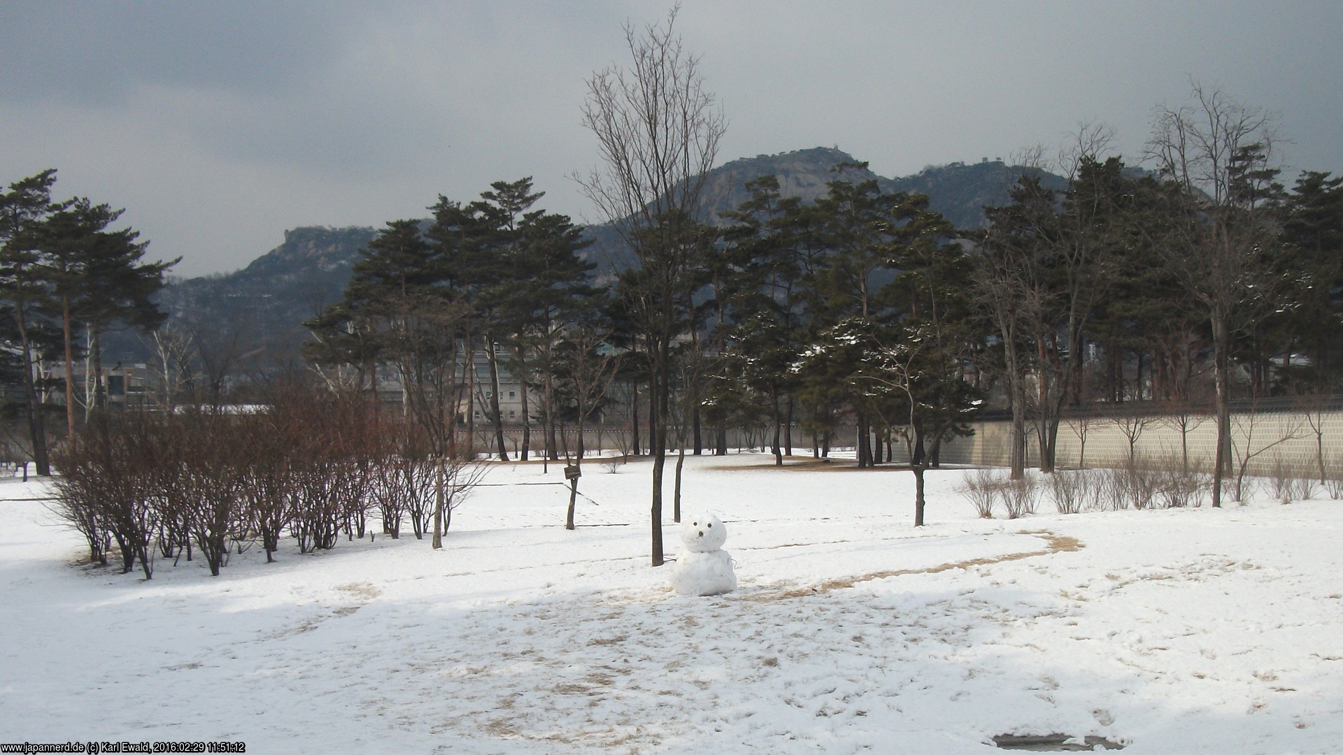 Montags haben viele Sehenswürdigkeiten und Museen in Korea geschlossen. Prinzipiell kann der Ruhetag jeweils unterschiedlich irgendein Wochentag sein, selten auch keiner, aber viele scheinen sich für den Montag zu entscheiden. Praktisch also, dass der Hauptpalast da eine Ausnahme macht und Dienstag schließt, so lag es nahe, am Montag dorthin zu gehen. Ich hatte den Tag gemächlich angehen lassen und ging zu Fuß die Yulgok-ro entlang. Ein Eckturm der Palastanlage ist inzwischen auf eine Verkehrsinsel gebannt und bildet einen krassen Kontrast zu dem dahinterliegenden (vom Palast weg nach Südost blickend) ovalen Hochhausneubau (auf Google Streetview 2009 noch nicht vorhanden):