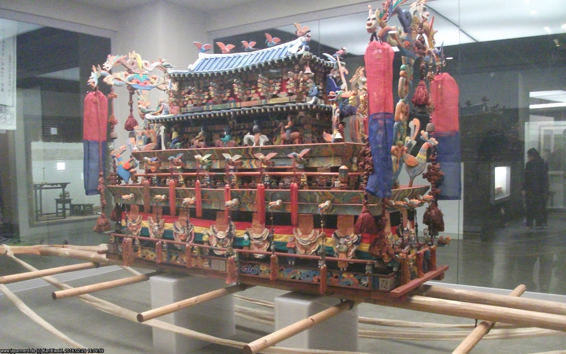 rechts hinter dem Palast befindet sich das National Folk Museum, das koreanisches Brauchtum zeigt, beispielsweise Kleidung, Nahrung und ihre Zubereitung, Medizin: Die Herstellung von Dubu (Tofu) ist erläutert, es gibt ein Stoffpuppe, auf der die Akupunkturlinien aufgezeichnet sind, typische Gerichte und die verschiedenen Varianten von Kimchi, oder eine Totenbahre, die in einer Gemeinde zum gemeinsamen Gebrauch vorgehalten wurde: