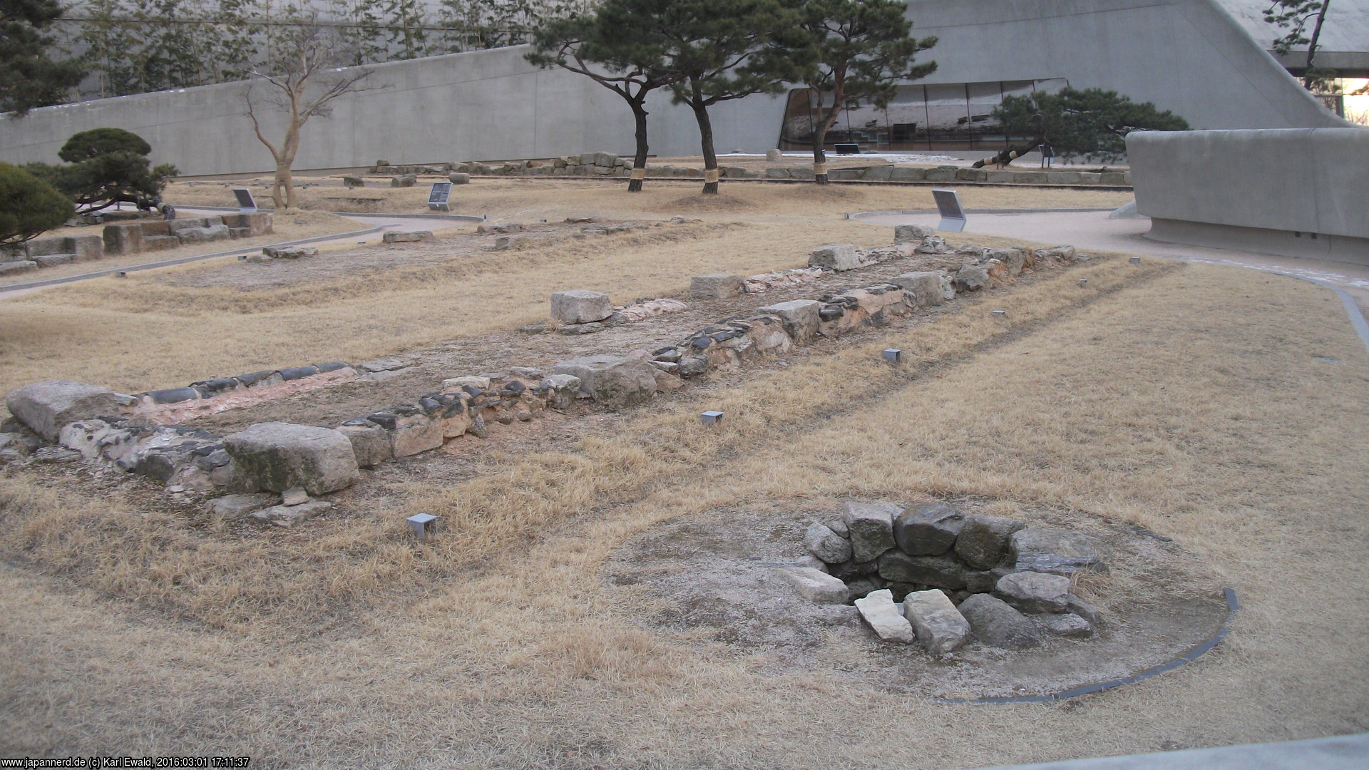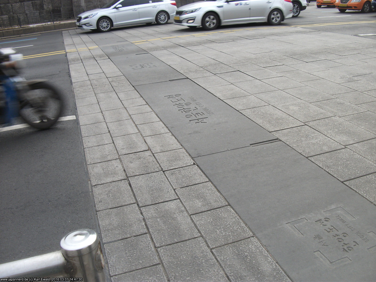Während 1704-1712 noch ein groß angelegtes Erneuerungsprojekt die Mauer durch Verwendung größerer Steinquader verstärkte, und ihre Bedeutung von den folgenden Monarchen anerkannt wurde, haben die bösen Japaner ab 1907 auf die Zerstörung von Teilen der Mauer gedrungen, aber nach dem zweiten Weltkrieg ging das ganze auch in der Unabhängigkeit erst einmal unvermindert weiter. Sehr überraschend finde ich das nicht, in der vergrößerten Stadt ist so eine Mauer ja auch immer ein Hindernis. Inzwischen wird die Mauer nach und nach instandgesetzt, wieder aufgebaut (siehe Baustelle am Namsan), oder wo das nicht zweckmäßig ist, durch Pflastersteine die ehemalige Position illustriert: