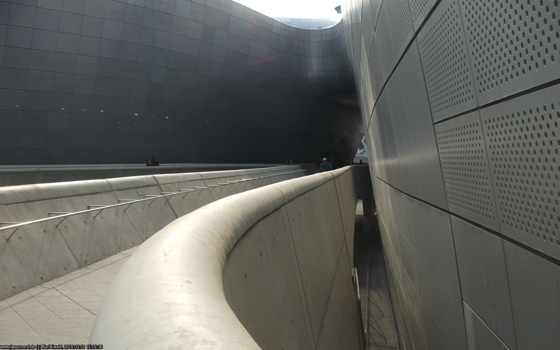 Mein nächstes Ziel war der unweit gelegene Dongdaemun History and Culture Park. Auf dem Gelände eines während der japanischen Besatzungszeit errichteten und vor einigen Jahren abgerissenen Stadions ist hier ein kleines Museum, Außenanlagen sowie mit DDP “Dongdaemun Design Plaza” ein multifunktionales futuristisches Gebäude entstanden, das unter dem Motto “Dream Design Play” gar nicht vollmundig beschrieben wird: “DDP is an epicenter of design and the creative industries, where Seoulites as well as global citicens learn about and experience the latest design trends and knowledge.”