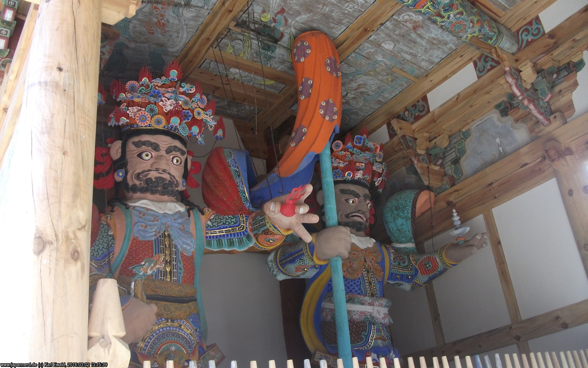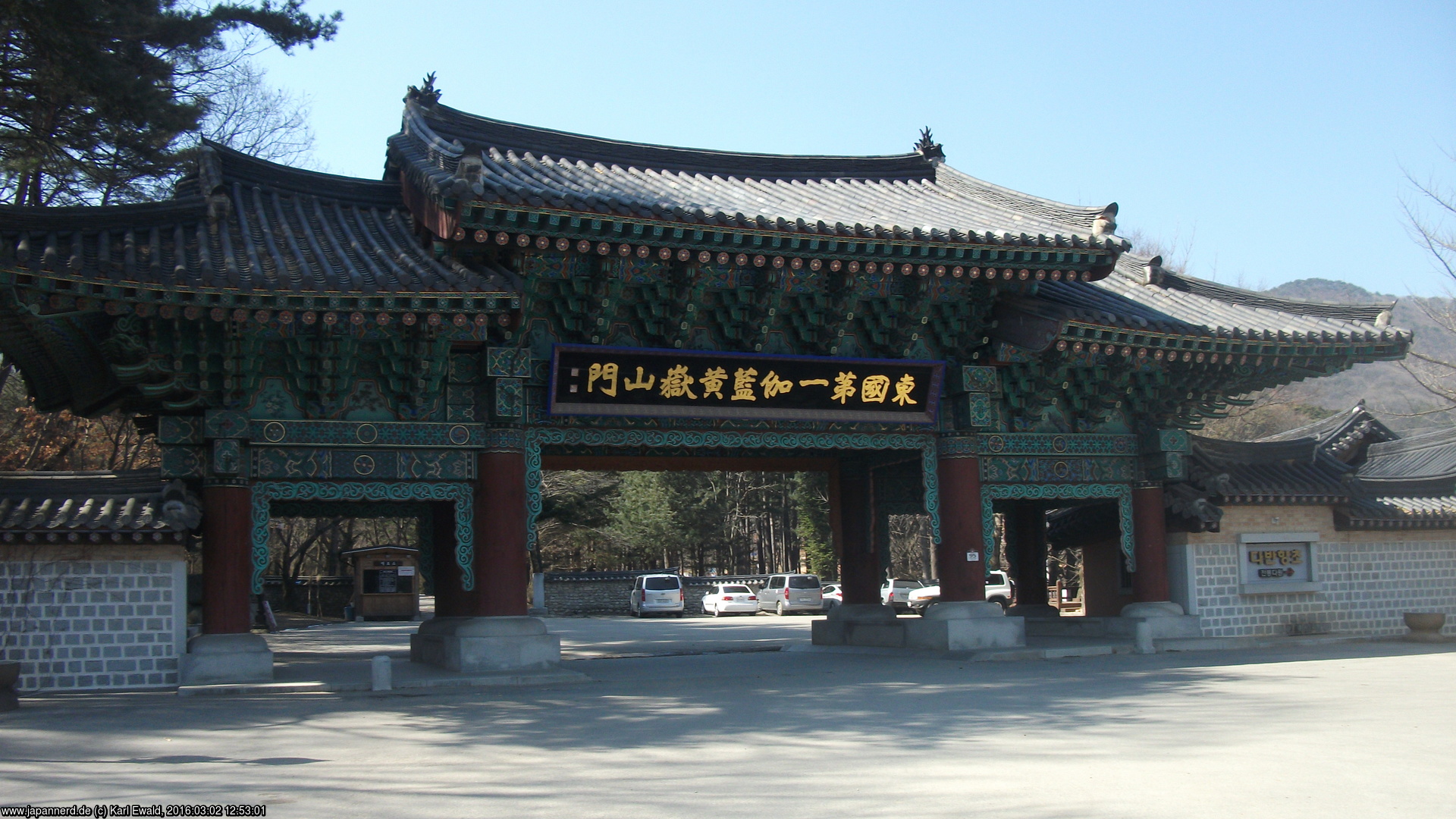 Das nächste Tor ist das Cheonwangmun, das Tor der vier himmlischen Könige. In der koreanischen Tradition hat der Himmelskönig des Ostens eine Laute (Mandoline), der des Südens ein Schwert, der des Westens einen Drachen und ein wunscherfüllendes Juwel, und der des Nordens eine Stupa/Pagode in der Hand.