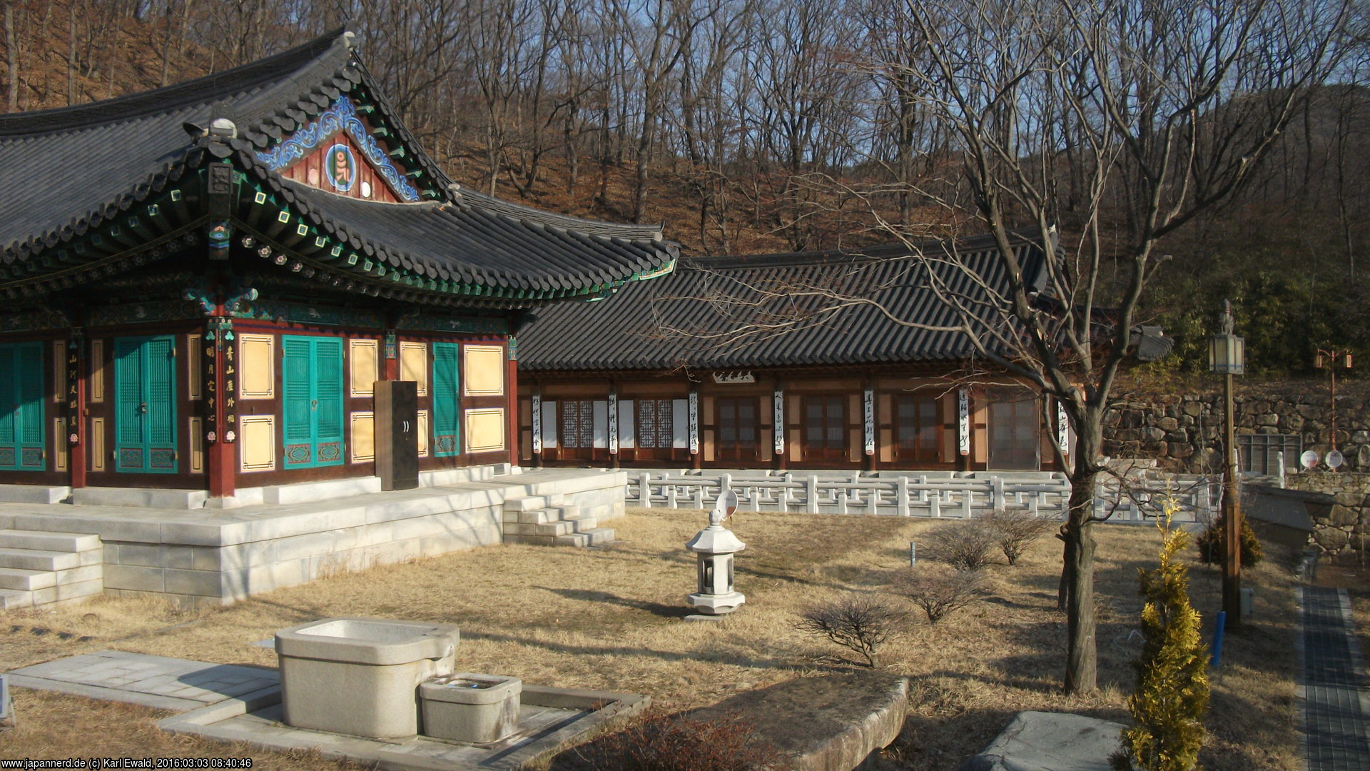 Die Templestay-Unterkunft liegt in einem recht neuen Gebäude gleich links vor der großen Buddha-Halle, an diesem Tag war ich einer von zwei Templestay-Besuchern. Ich hatte ein eigenes geräumiges Zimmer mit Fußbodenheizung (in Korea sehr verbreitet, man ist stolz auf die Ondol-Tradition) und eigenem Bad: