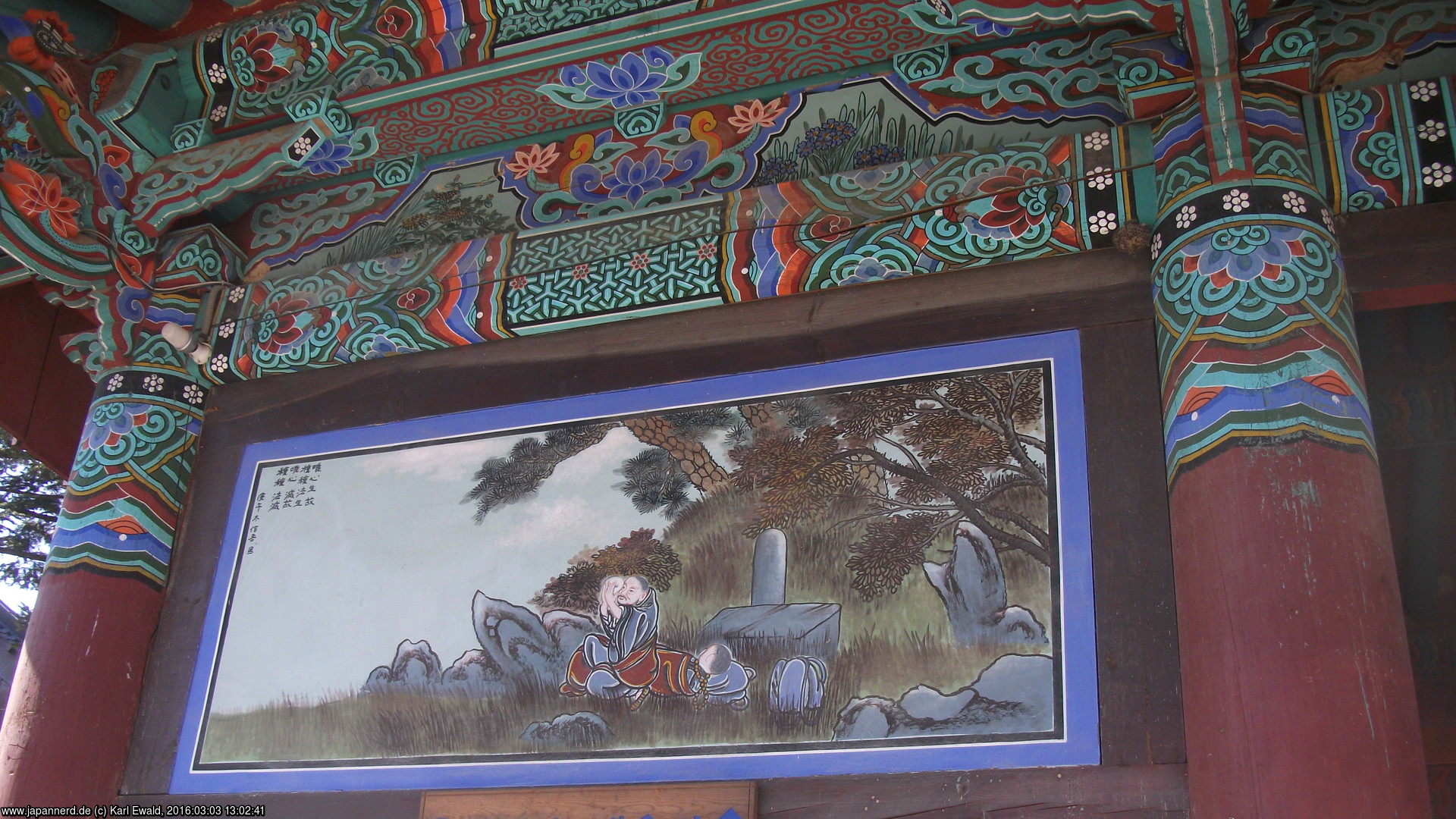 Wir sind erst einmal die Tore zum Tempel der Reihe nach abgegangen. Das erste ist in koreanischen Tempeln das Iljumun, das Ein-Säulen-Tor (von der Seite betrachtet, von vorn hat es zwei Säulen, es gibt auch die Variante mit vier Säulen und drei Durchgängen). Als nächstes kam ein Tor mit Bildtafeln, die Geschichten aus der Anfangszeit des Tempels darstellen. Dabei ist mir folgende besonders in Erinnerung: