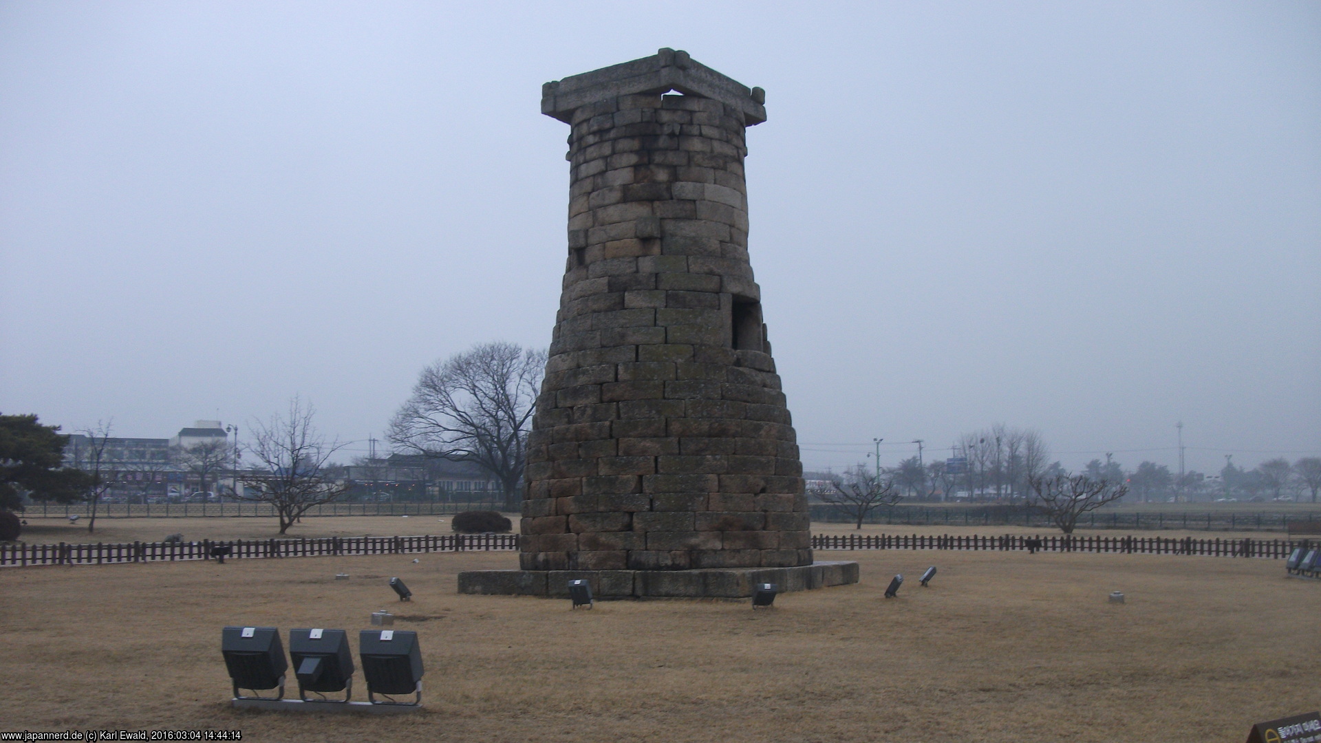 Die Cheomseongdae Sternwarte entstand im Zeitraum 632-647 und in ihrer Konstruktion finden sich einige markante Zahlen: 365 Steine (Tage im Jahr), 29 Stein-Ebenen (Mondmonat), Zwölf Grundsteine (Monate im Jahr) usw. Ein Häuschen nebenan bietet eine interaktive Multimedia-Info zu dem Bauwerk.