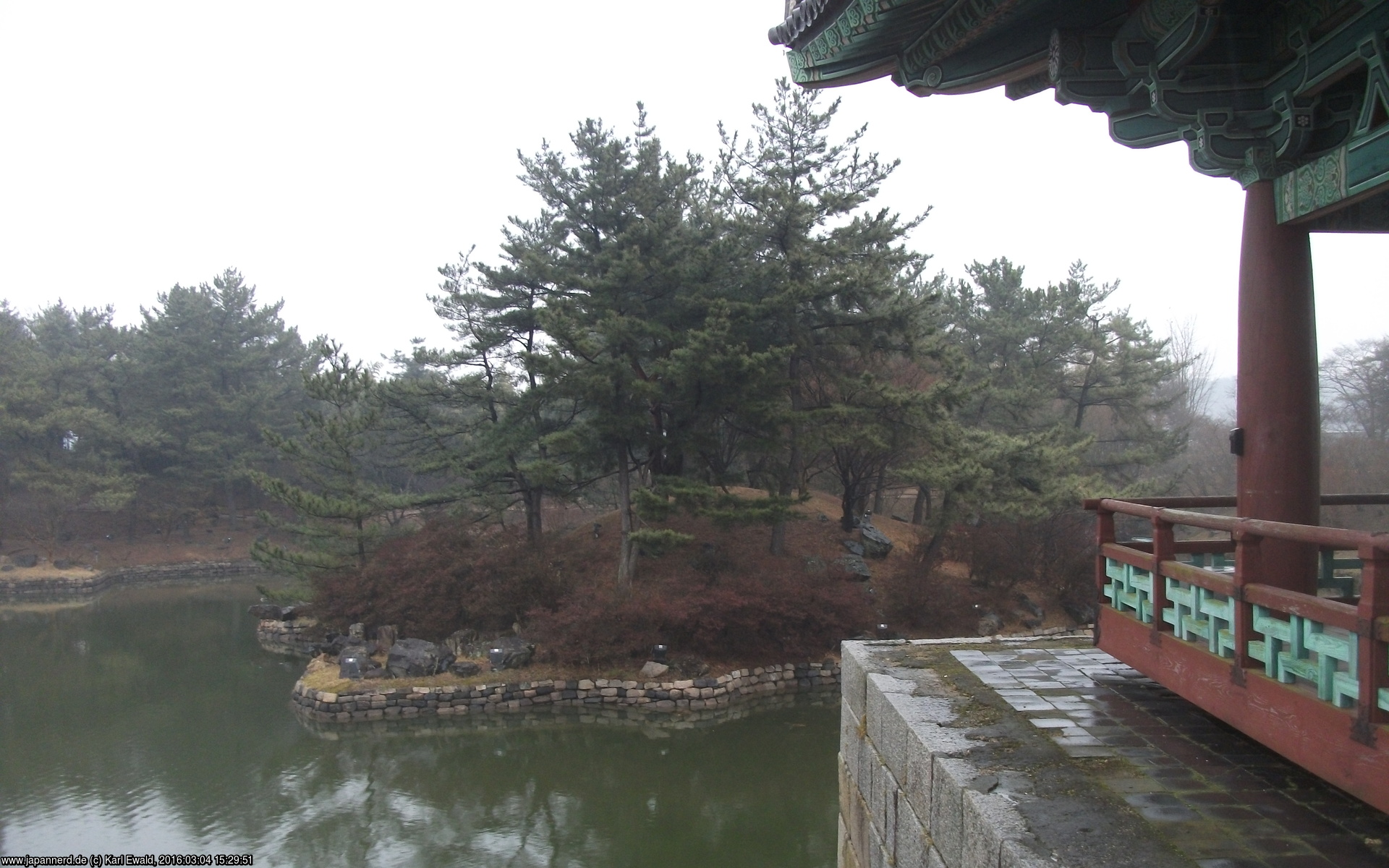 Nach Osten weitergehend, erreiche ich Wolji Pond (früher Anapji Pond genannt), einen Teich, um den früher der Donggung Palast des Silla-Reichs gebaut war, von den Gebäuden sind heute drei Pavillions wieder aufgebaut, ansonsten deuten Grundsteine die Ausmaße der früheren Anlage an.