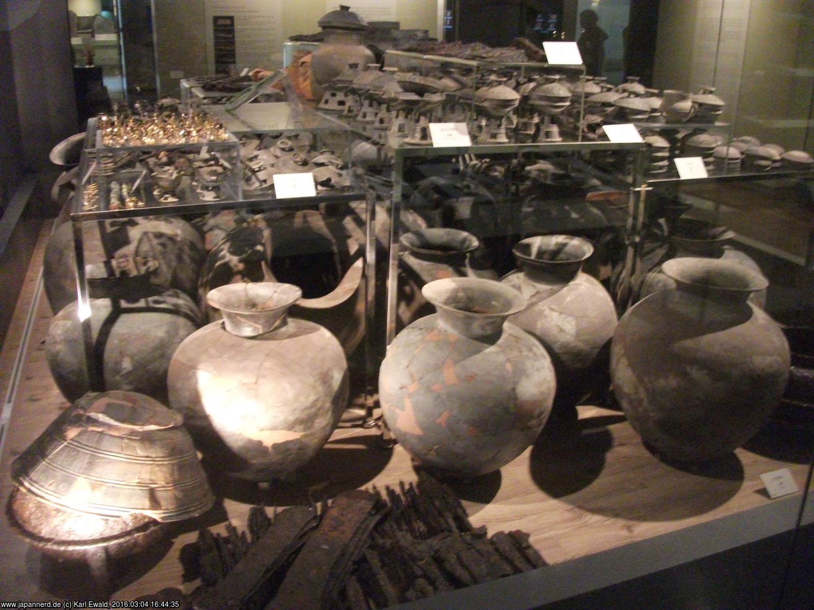 Schräg gegenüber von Wolji Pond schließlich befindet sich das Gyeongju National Museum, das bei freiem EIntritt mehrere Gebäude voll Silla-Vergangenheit bietet. Das Hauptgebäude widmet sich der Geschichte des Reiches, angefangen von der Steinzeit hin zu einem staatenhaften Gebilde, die schrittweise Erweiterung des Reiches, Verwaltung und Struktur, Lebensweise. Großen Raum nimmt die Ausstellung von Fundstücken ein, und da fand ich die Grabausstattungen, die sich in den diversen Hügeln befanden, das faszinierendste.