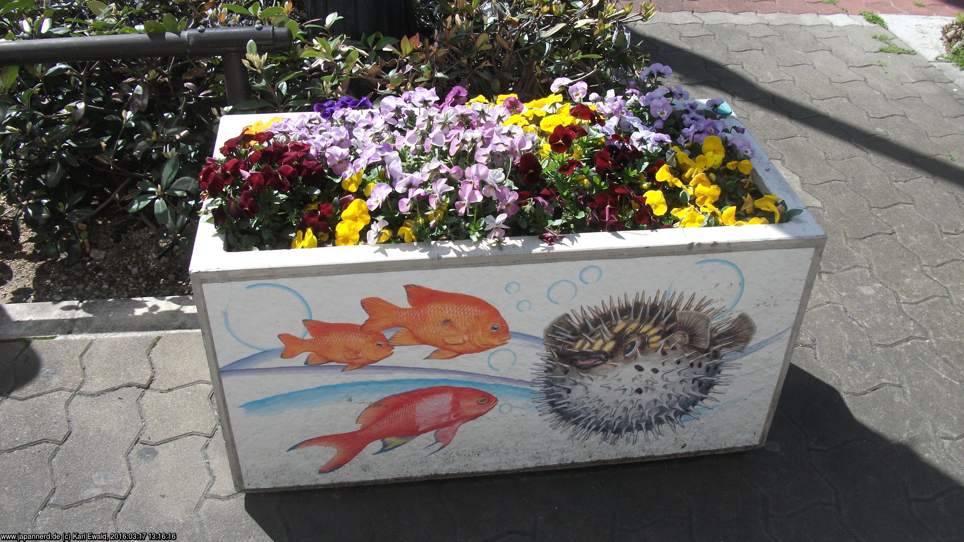 Passend zum Aquarium sind die Blumenkästen auf dem Weg zur Subway-Station mit Fischmotiven verziert.