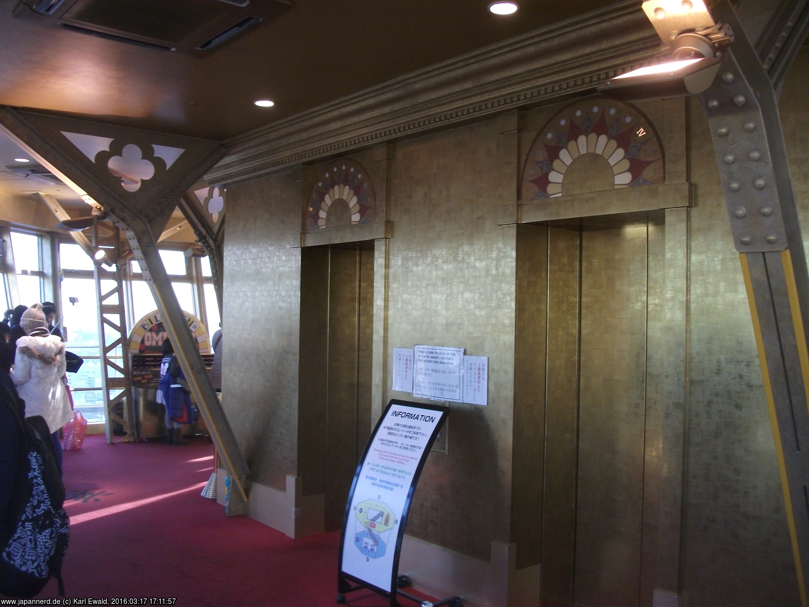 Der Lift hat Fenster, man kann also beim Rauffahren ein wenig rausgucken. Im Aussichtsgeschoss ist alles goldfarben, es handelt sich ja quasi um den Billiken-Tempel.