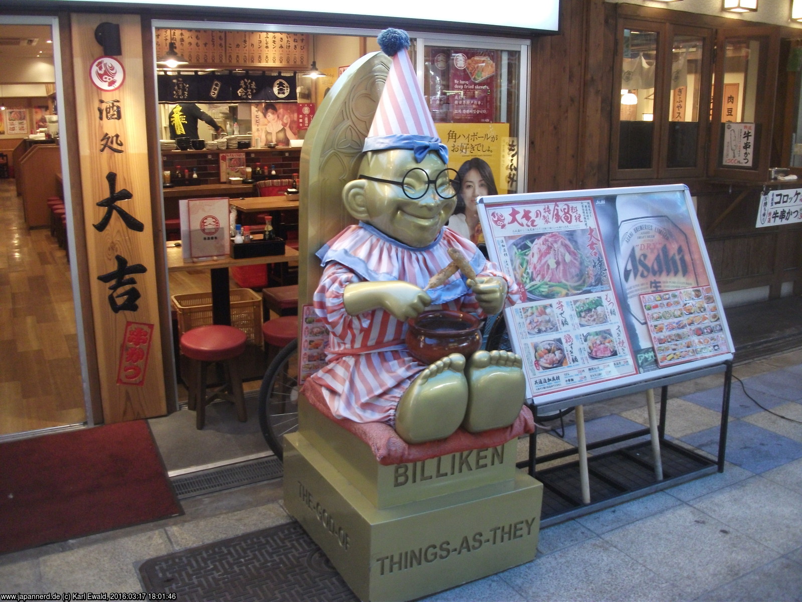 Billiken ist aber nicht nur im Tsutenkaku-Turm Motto, sondern in Shinsekai insgesamt. An jeder Ecke steht eine Statue, und vor diesem Restaurant wurde eine besonders ausgestattet: