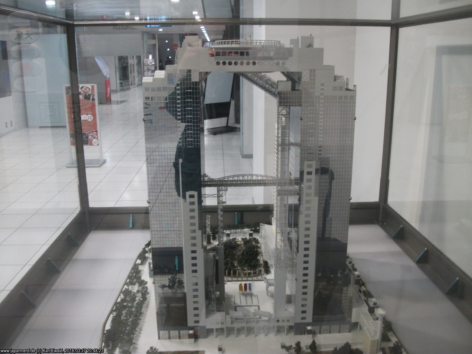 Das Floating Garden Observatory ist als Brücke zwischen die beiden Türme des Umeda Sky Buildings aufgesetzt, hier ein Modell in der Eingangshalle: