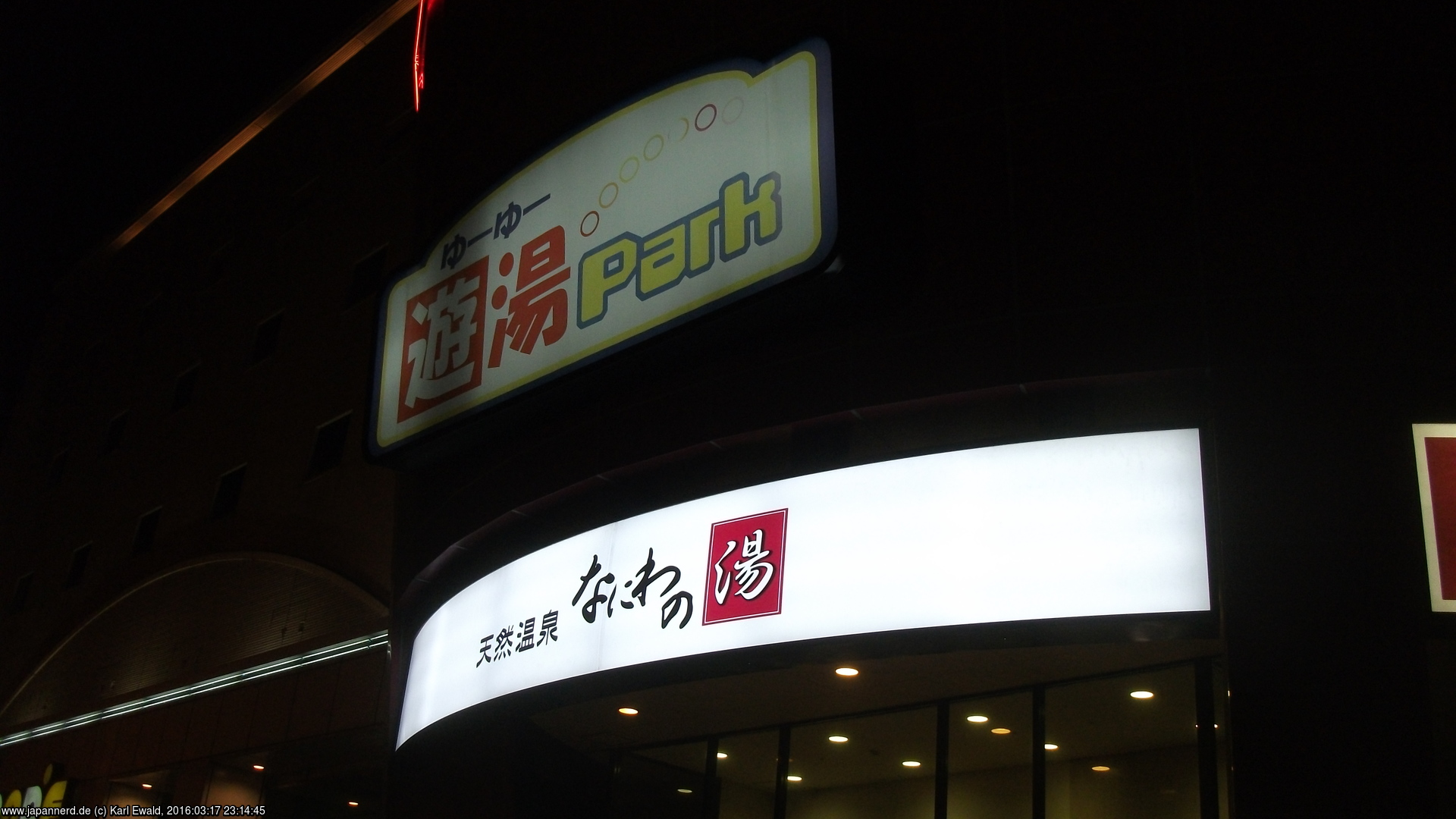 Auch den zweiten Tag wollte ich mit einem entspannenden Bad ausklingen lassen, dazu bin ich zu den anderen der beiden im Amazing Pass enthaltenen, dem Naniwa no Yu, gefahren. Es wäre hilfreich, wenn das Heftchen den Hinweis enthaltenwürde, dass es sich im achten Stock eines Pachinko-Spielsalons befindet, denn die Beschriftung am Gebäude ist ausschließlich auf japanisch: