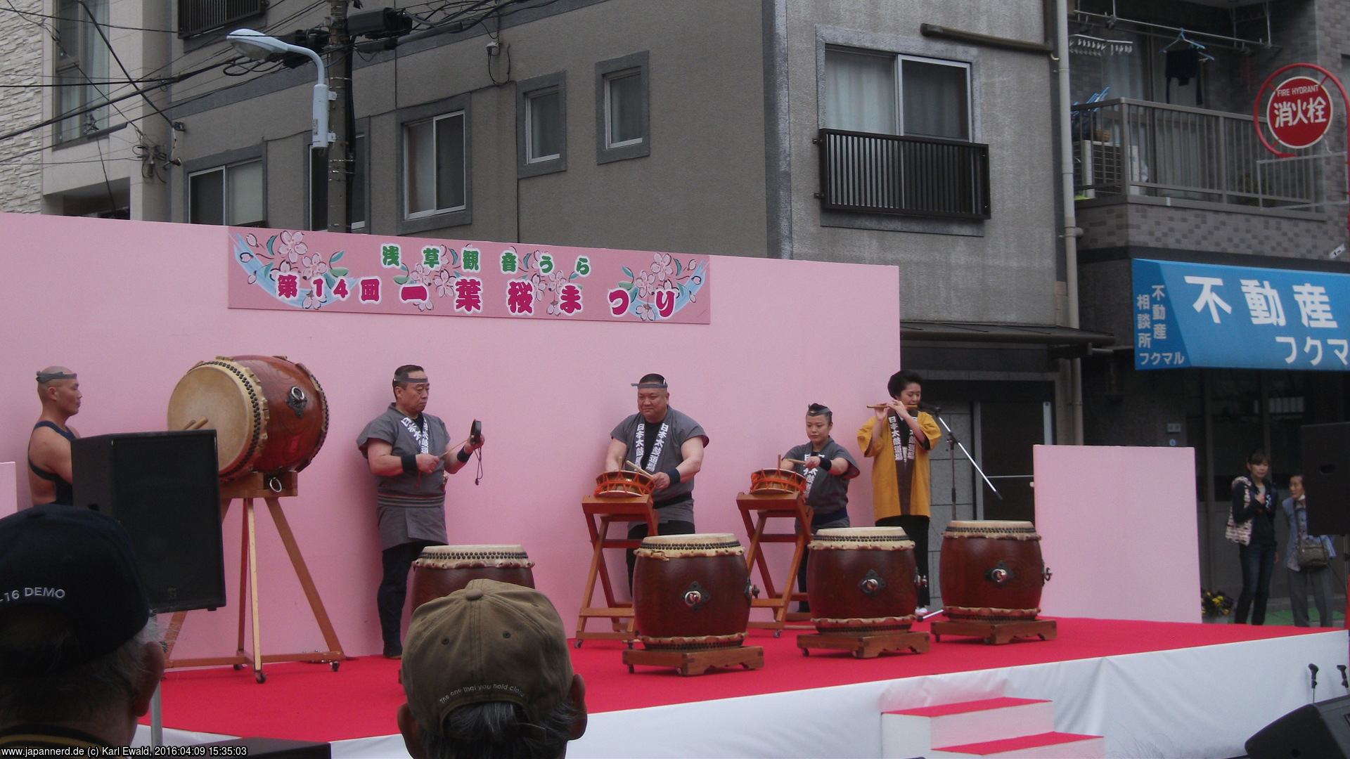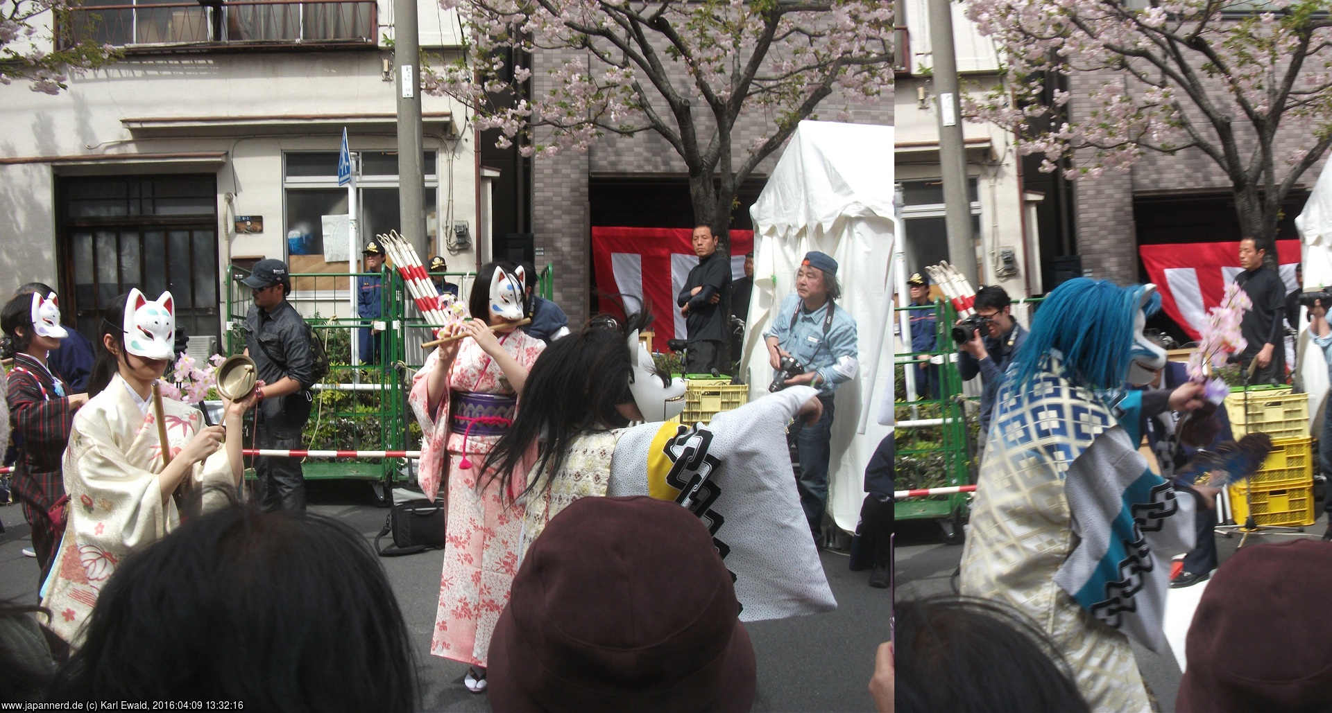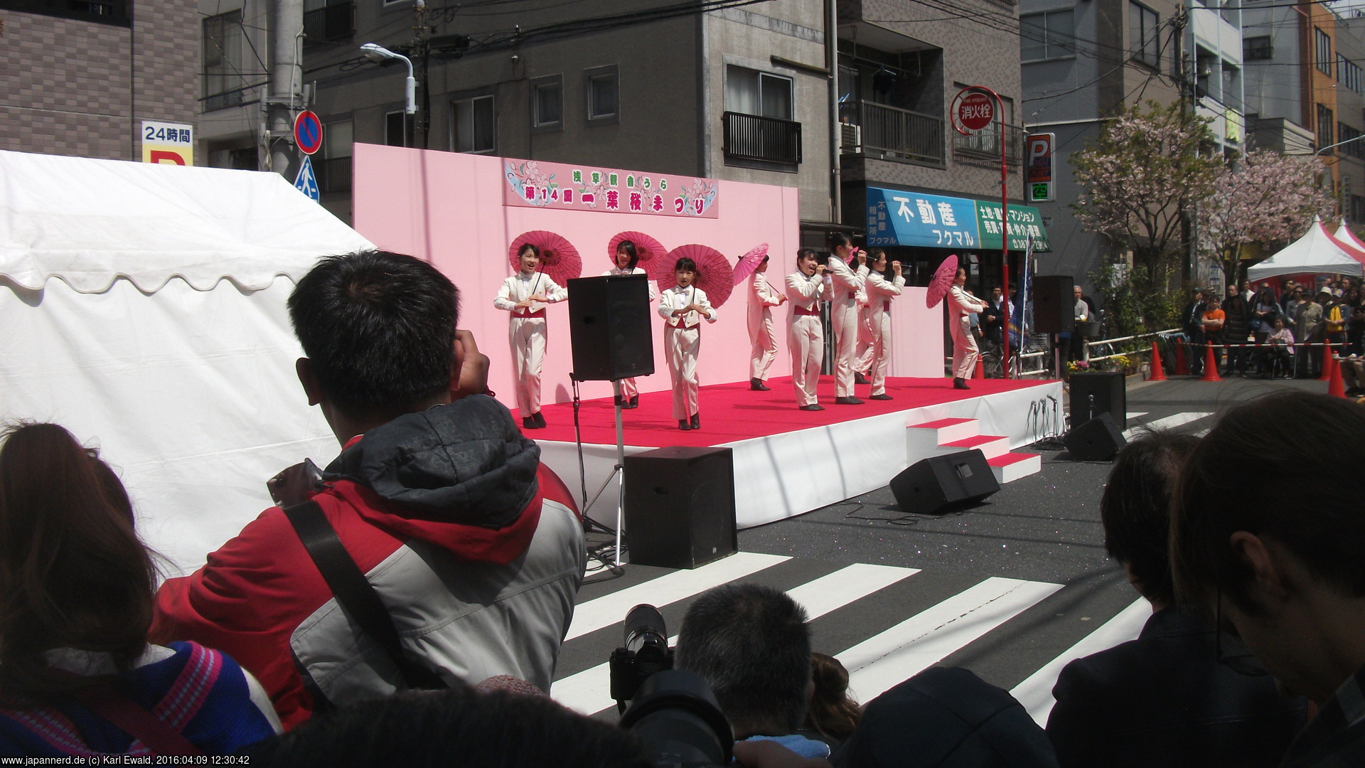 Am Samstag, den 9.4.16 habe ich das Asakusa Ichiyo Sakura Matsuri besucht (Beschreibung bei GoTokyo). Ort des Geschehens ist ein Straßenabschnitt der Komatsubashi-dori im nördlichen Asakusa, eine Kirschbaumallee, die mit der Kirschbaumart Ichiyo Sakura bepflanzt ist.