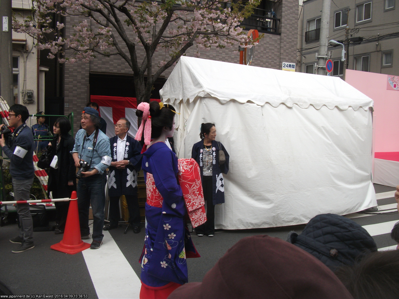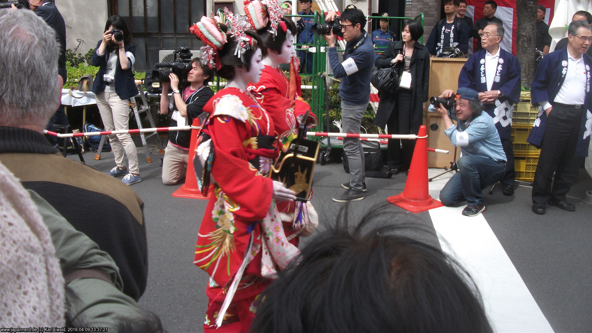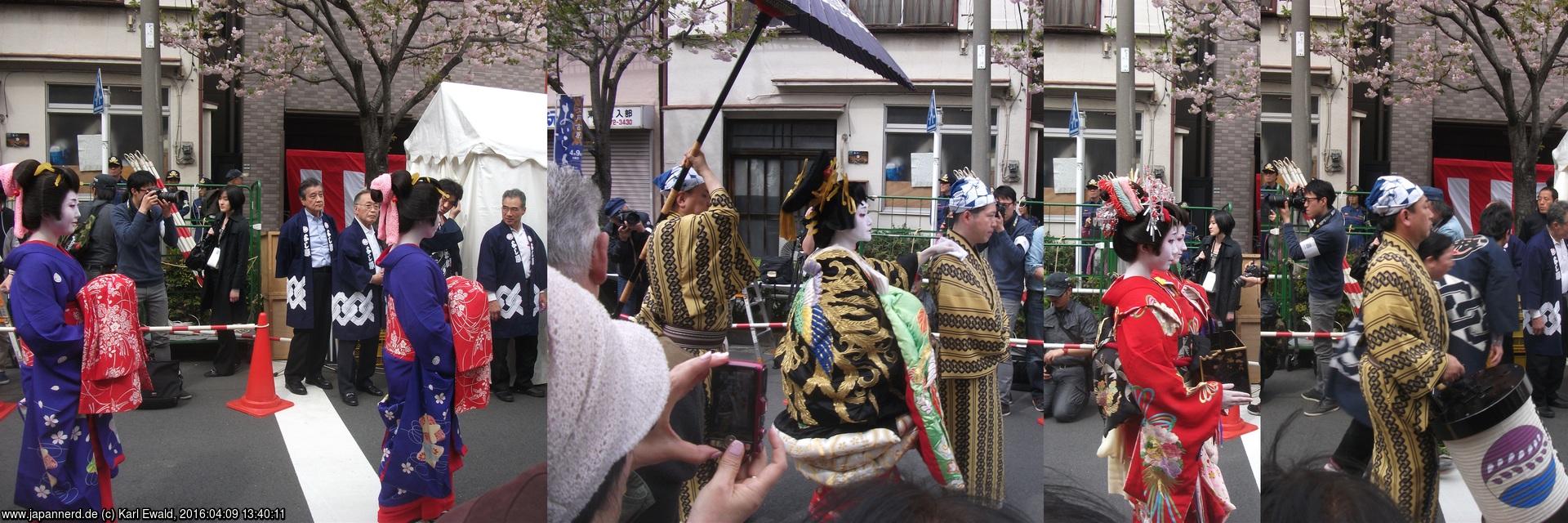 Am Samstag, den 9.4.16 habe ich das Asakusa Ichiyo Sakura Matsuri besucht (Beschreibung bei GoTokyo). Ort des Geschehens ist ein Straßenabschnitt der Komatsubashi-dori im nördlichen Asakusa, eine Kirschbaumallee, die mit der Kirschbaumart Ichiyo Sakura bepflanzt ist.