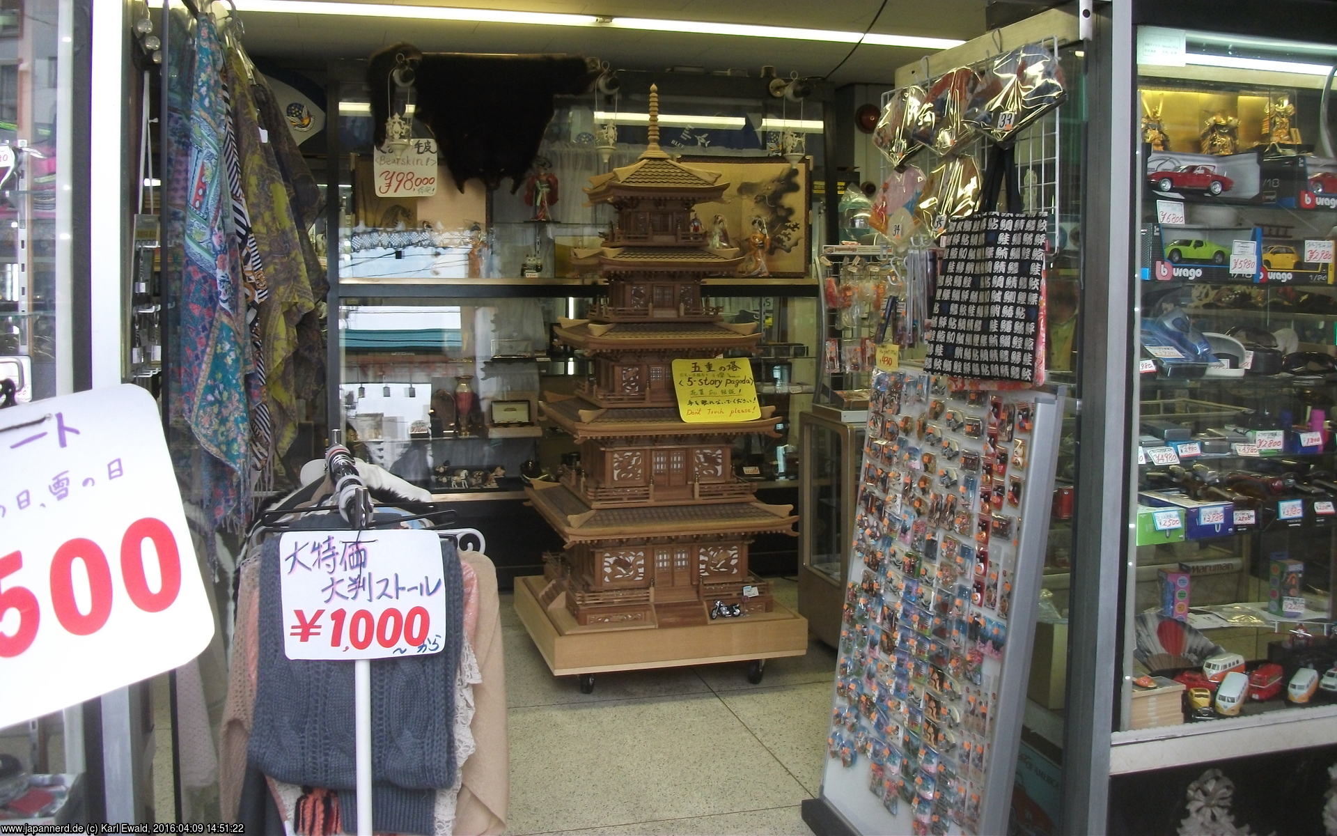 Wir bummelten durch die Ladenstraßen im Asakusa-Areal. Ein Laden, der ansonsten mit allem möglichen von Modellautos bis Fächern handelt, aber auch ein Bärenfell im Angebot hat, hatte eine fünfstöckige Pagode ausgestellt: