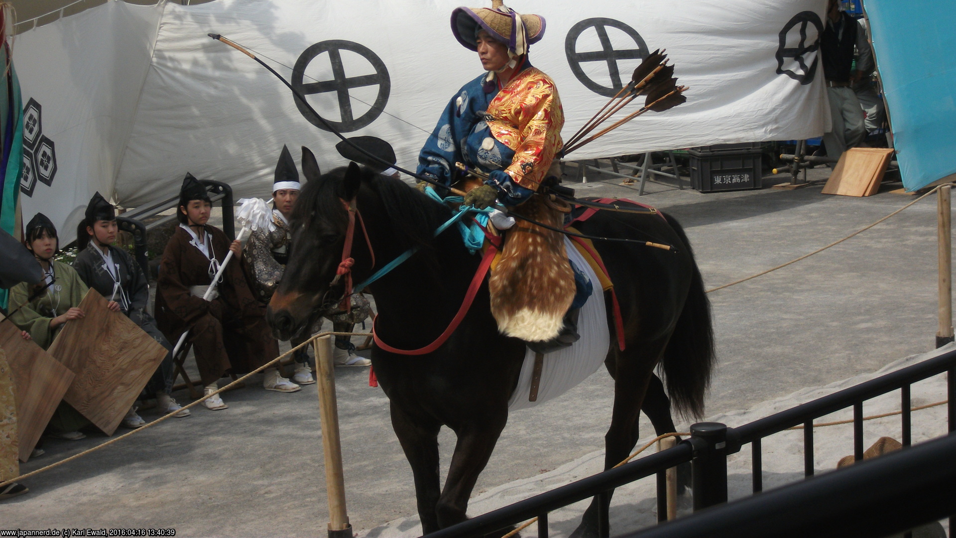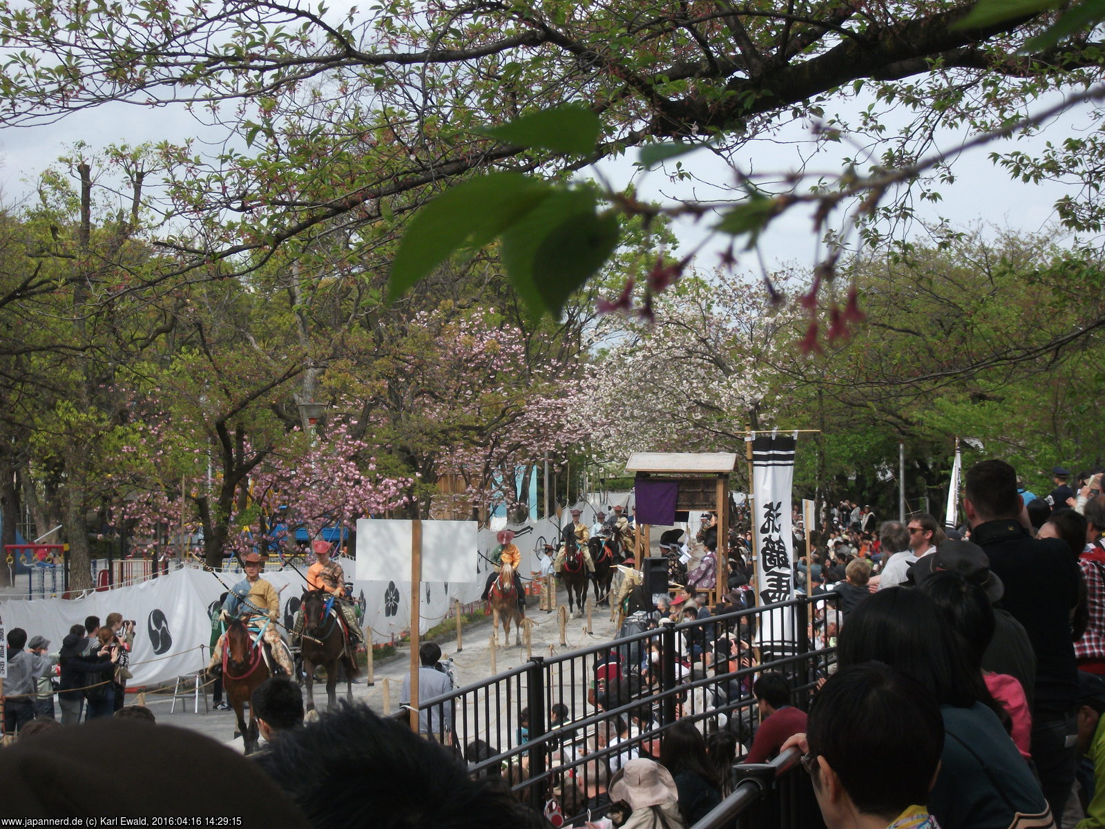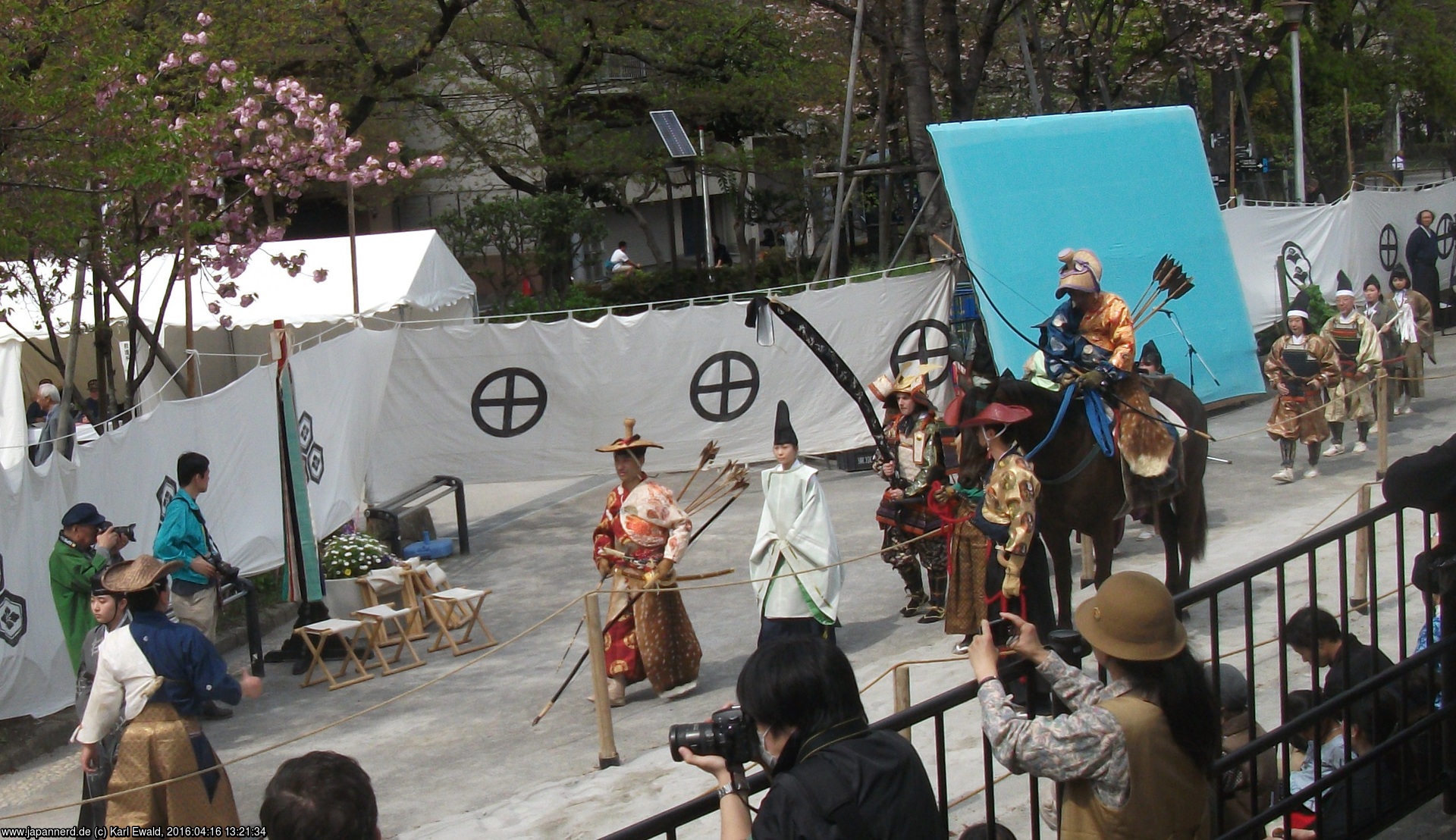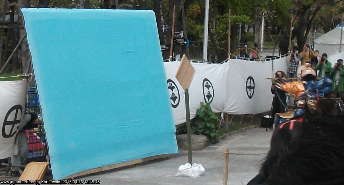 Die unterschiedlichen Symbole, die auf den weißen Tuchwänden entlang der Strecke aufgedruckt sind, sind übrigens Familienwappen. Einige davon sind in dieser Liste der Samurai-Wappen zu finden.