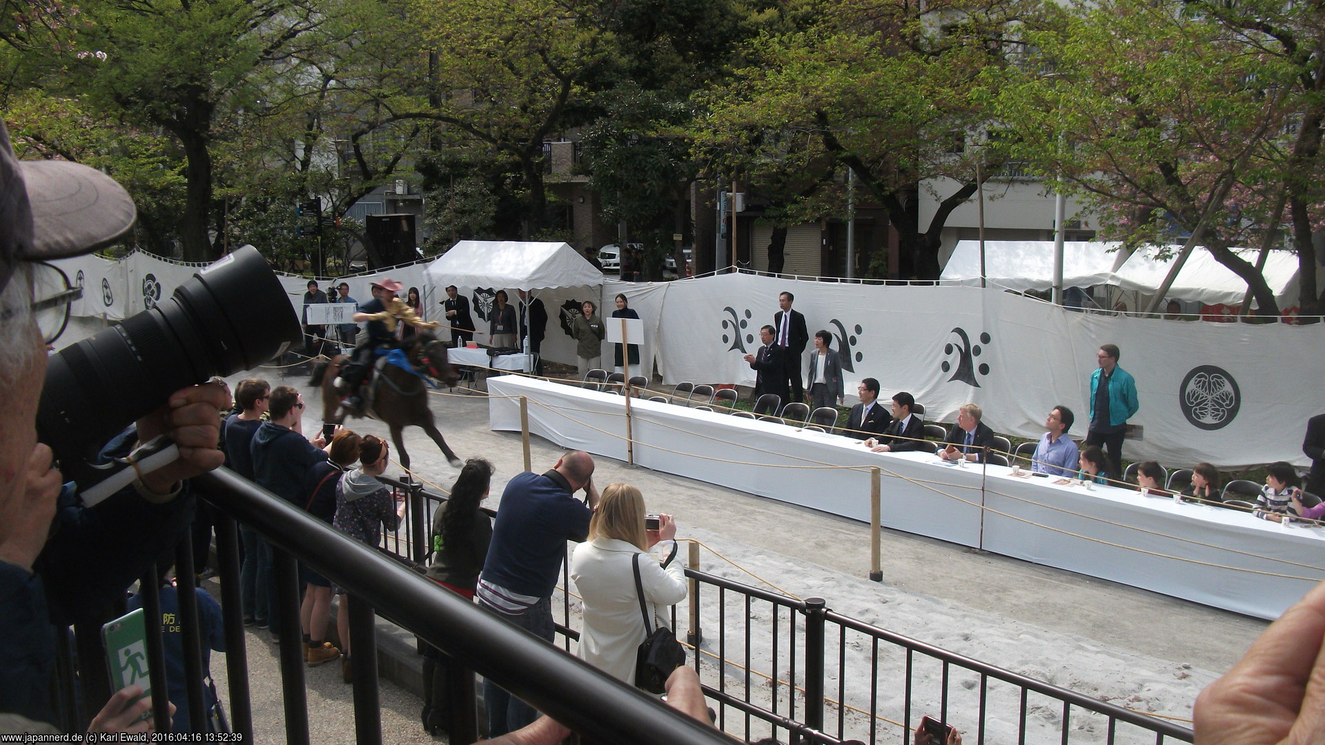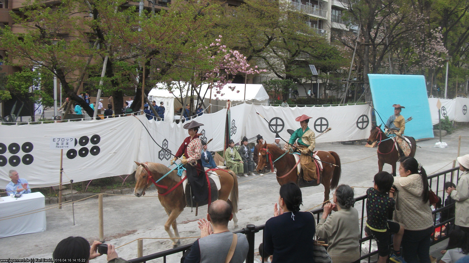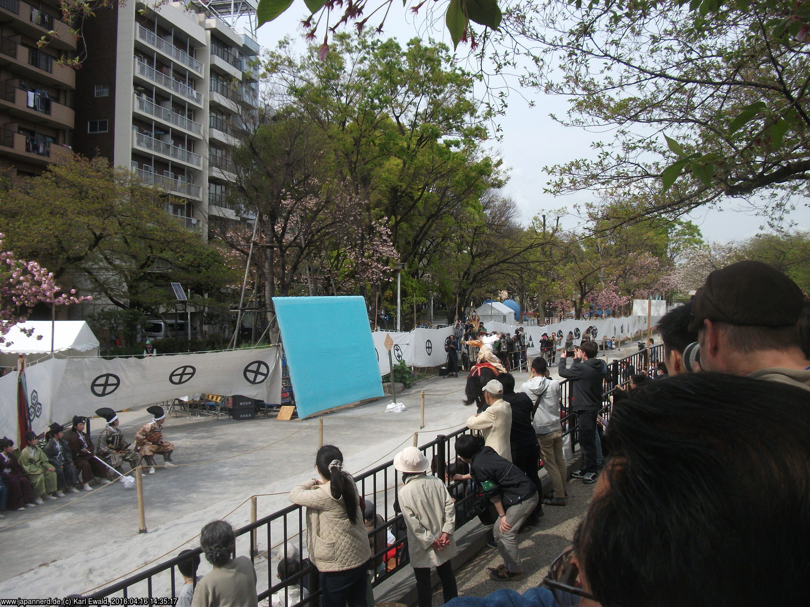 Die unterschiedlichen Symbole, die auf den weißen Tuchwänden entlang der Strecke aufgedruckt sind, sind übrigens Familienwappen. Einige davon sind in dieser Liste der Samurai-Wappen zu finden.