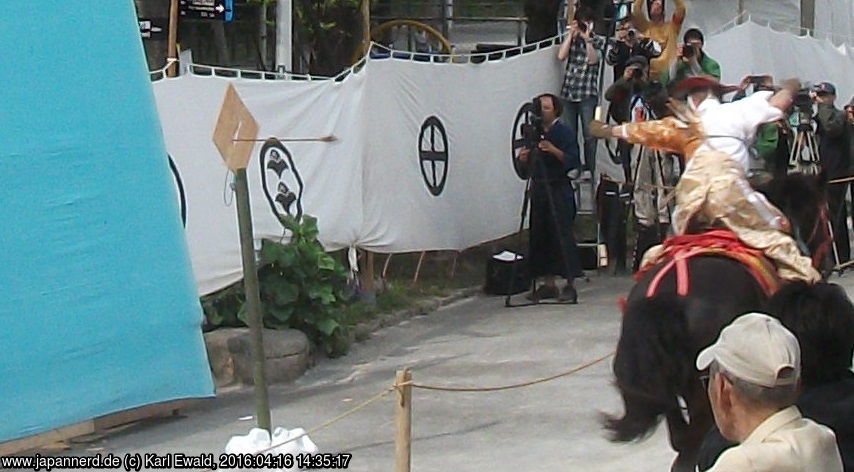 Konkret war das gestern ein Yabusame, das ist ein Reiterbogenschießen. Dieser Wettbewerb steht in einer jahrhundertealten Samurai-Tradition. Entlang einer Strecke von gut 250 Metern sind drei Ziele in jeweils 70 Meter Abstand aufgebaut, dabei handelt es sich jeweils um quadratische dünne Holzbretter, die rautenförmig in einem Ständer stecken. Der Bogenschütze versucht im schnellen Vorbeiritt möglichst viele davon zu treffen. Vom altgedienten Schützen mit über 25 Jahren Erfahrung bis zum Schüler reicht das Teilnehmerfeld, eine Frau und einige Ausländer sind auch dabei, überwiegend sind es wohl traditionsreiche Familien. Wenn ich mich recht erinnere, waren es 24 Teilnehmer.