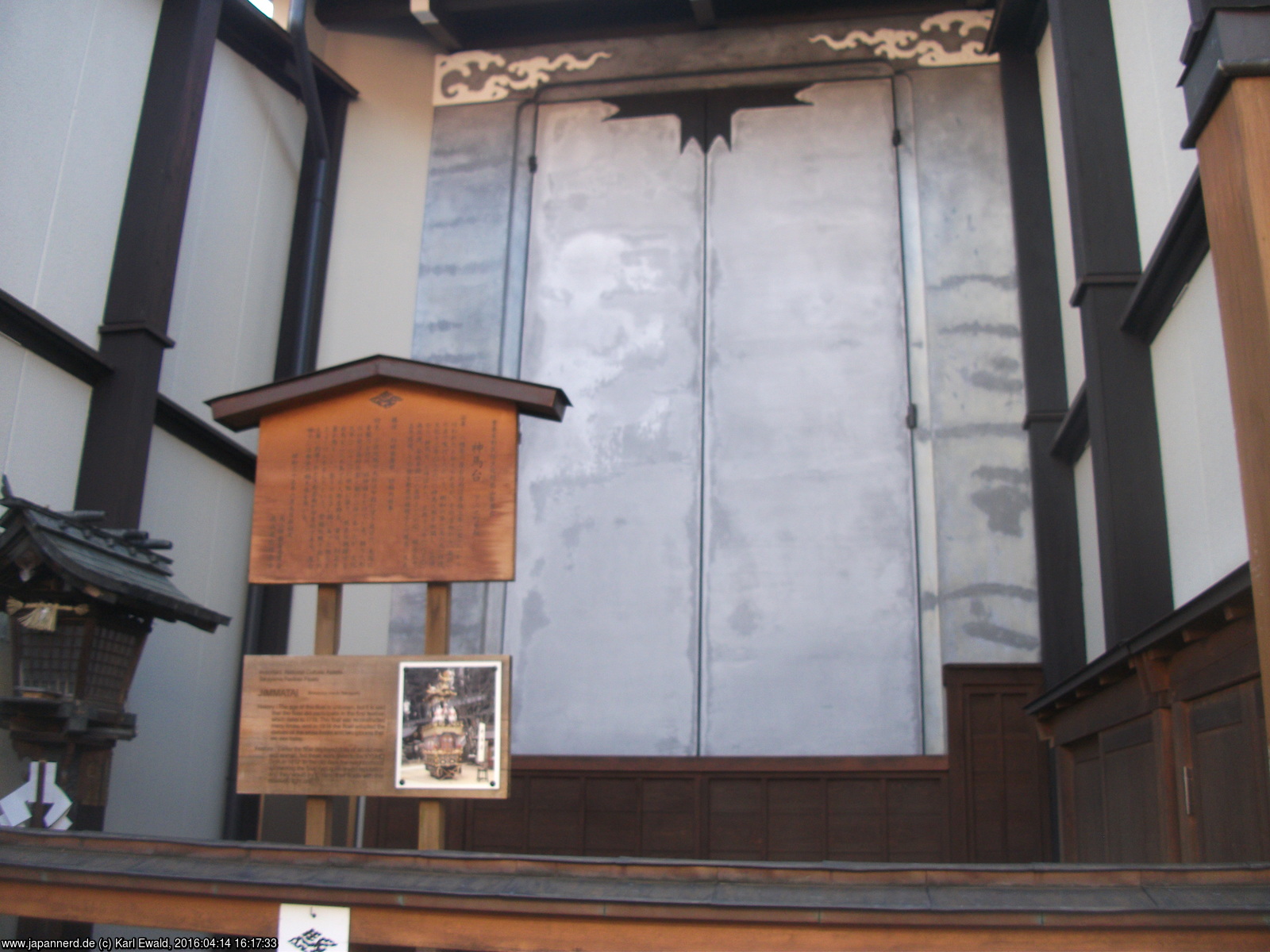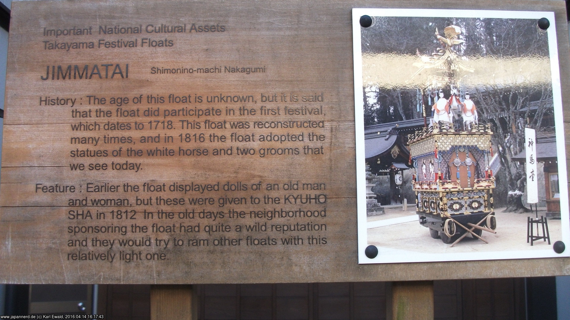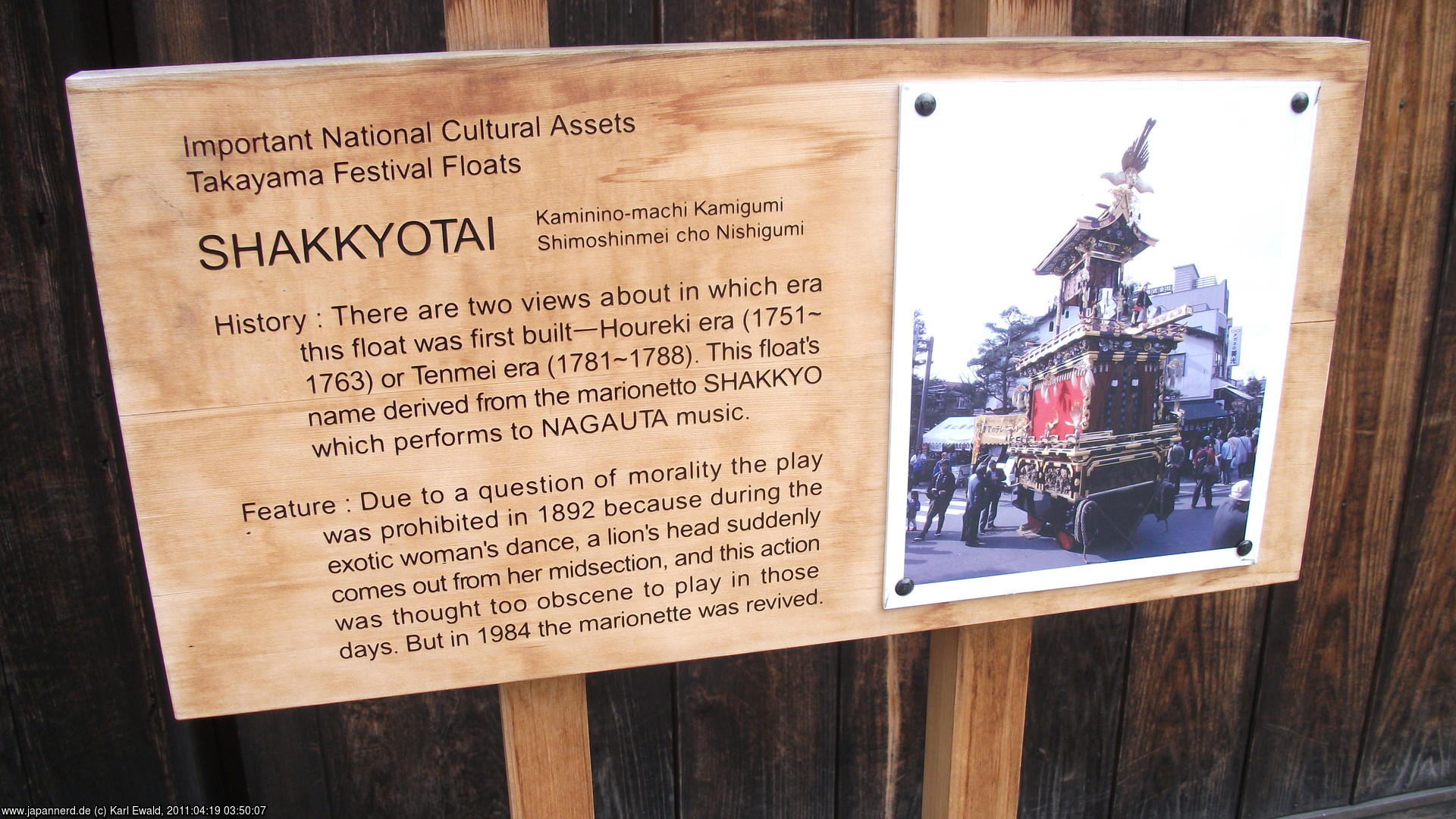 Takayama: Geschichte zu Shakkyotai, Tafel an der Garage des Wagens