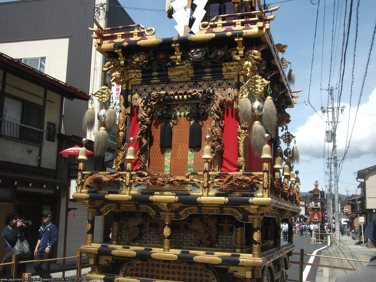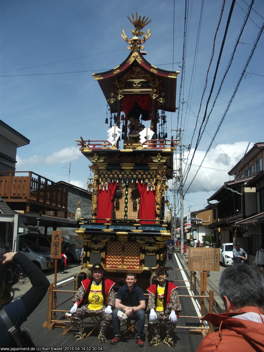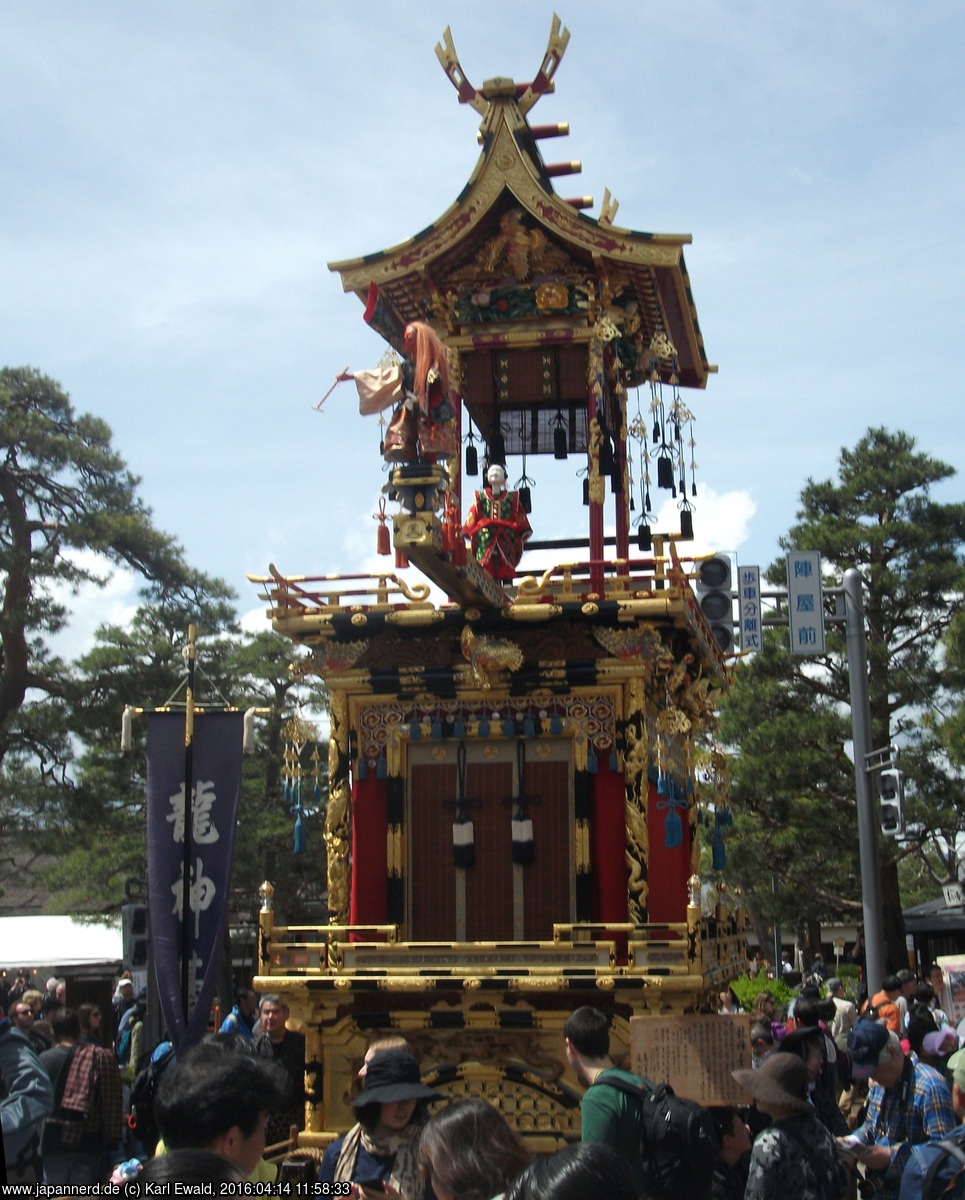 Takayama Spring Matsuri: Mikoshi-Prozession: der Mikoshi fährt unterhalb vorbei