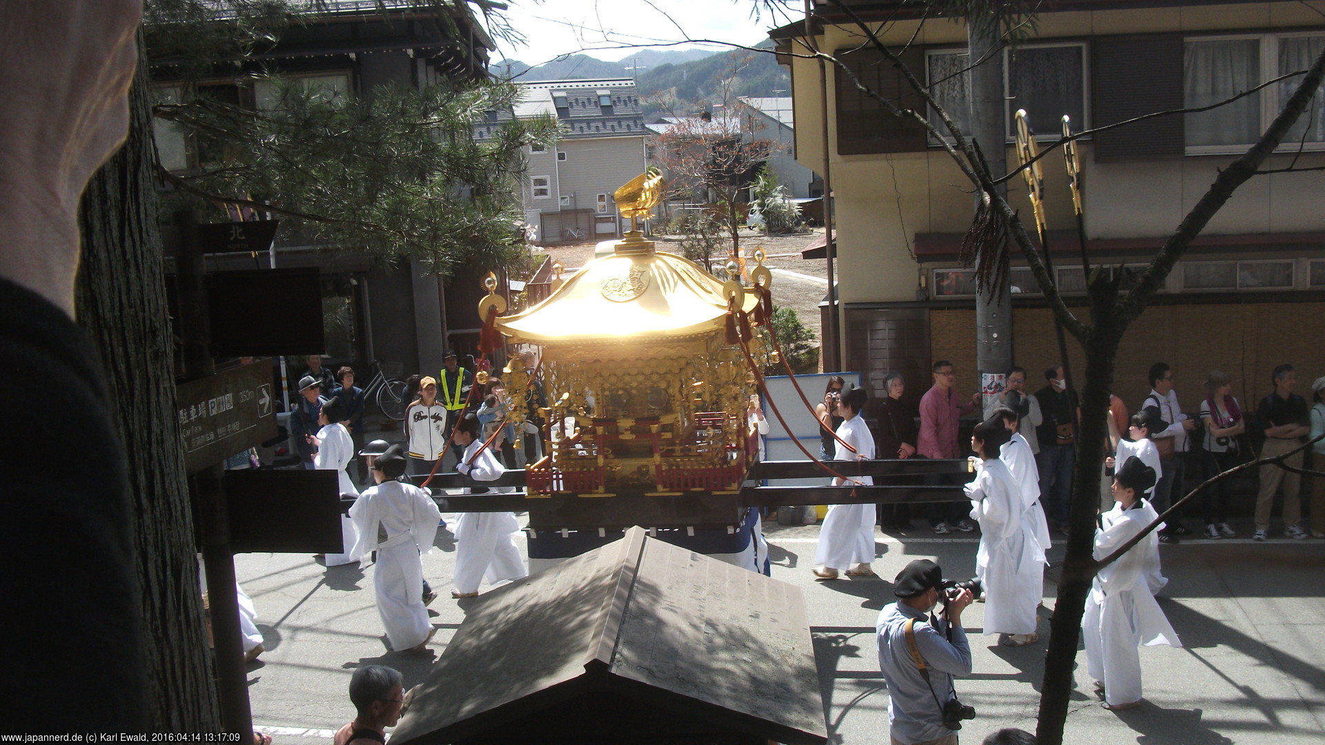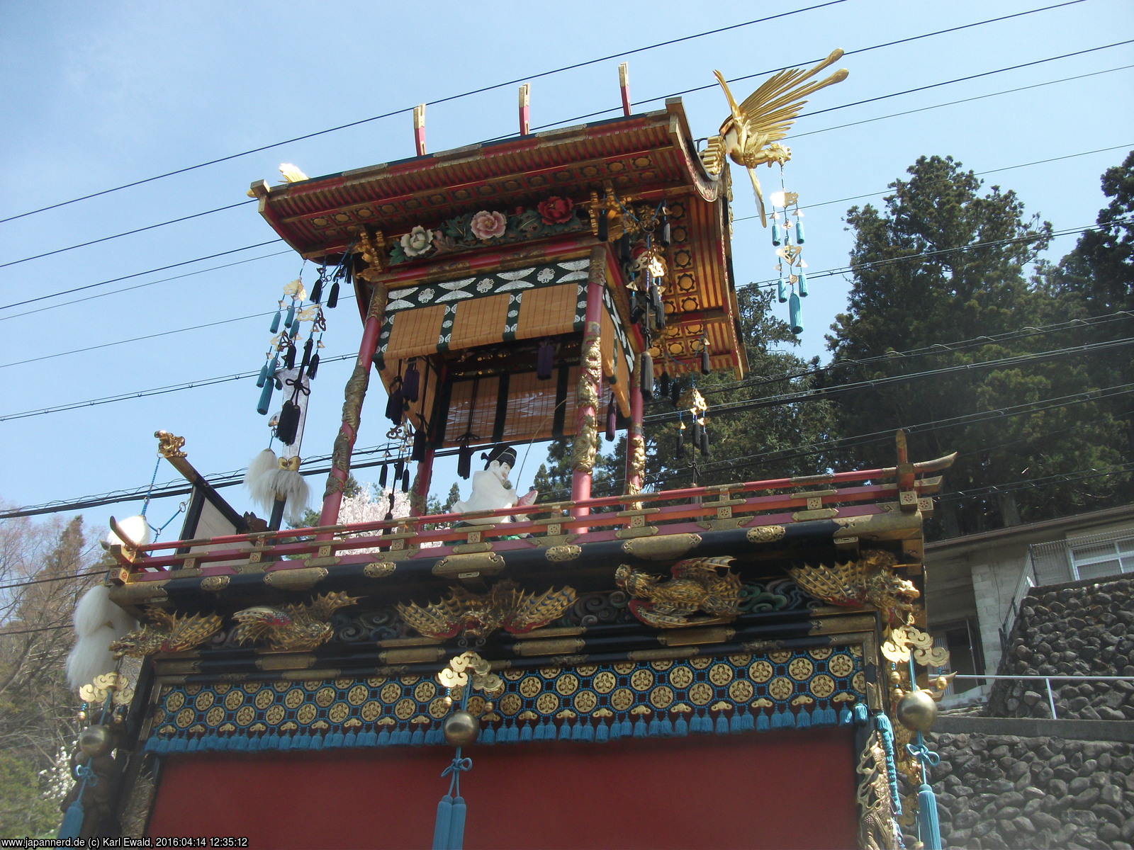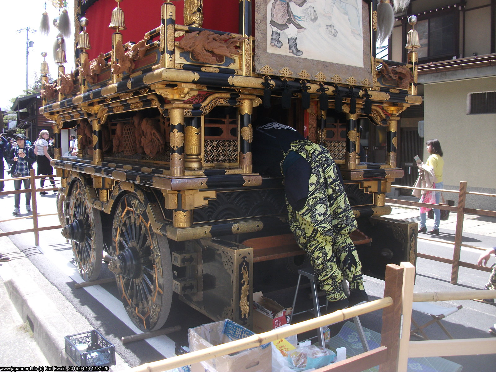 Takayama Spring Matsuri: Mikoshi-Prozession: der Mikoshi fährt unterhalb vorbei