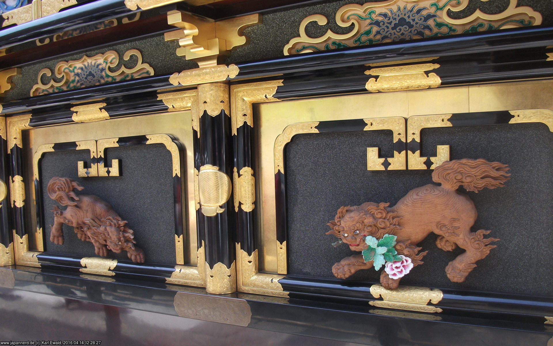 Takayama Spring Matsuri: Festwagen Daikokutai, geschnitzte Löwen an der Seitenwand