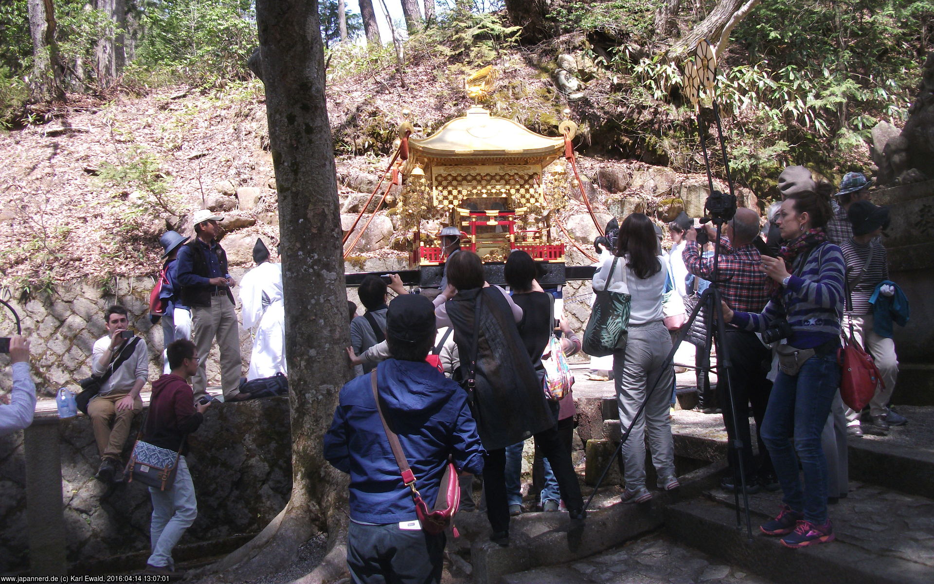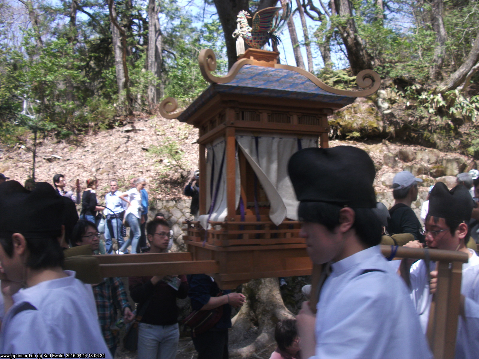 Die Prozession hat unten einen Bogen gemacht und zieht unterhalb des Weges zum Schrein vorbei, so sehe ich den Mikoshi nochmal im Sonnenlicht: