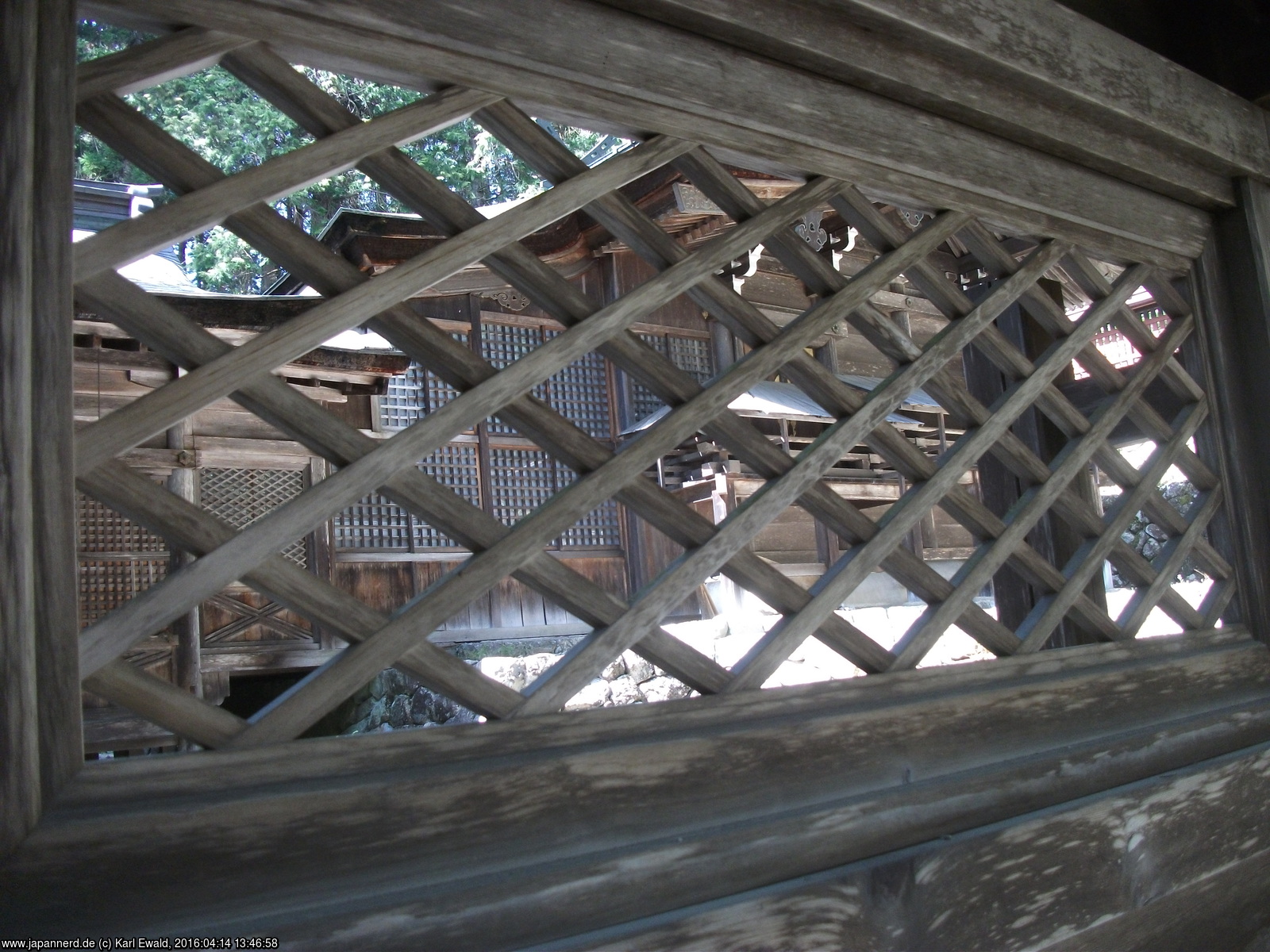 Hier nochmal klarer, durch eine Zaunraute fotografiert. Der Honden verfügt über ein asymmetrisches Dach, das vorne tiefer gezogen ist und so den Opfergang mit überspannt, und der Giebel ist mit den typischen Querhölzern belegt. Um die Wände des Honden ist ein kleiner Zaun gezogen, um den göttlichen Raum vom menschlichen sichtbar abzutrennen.