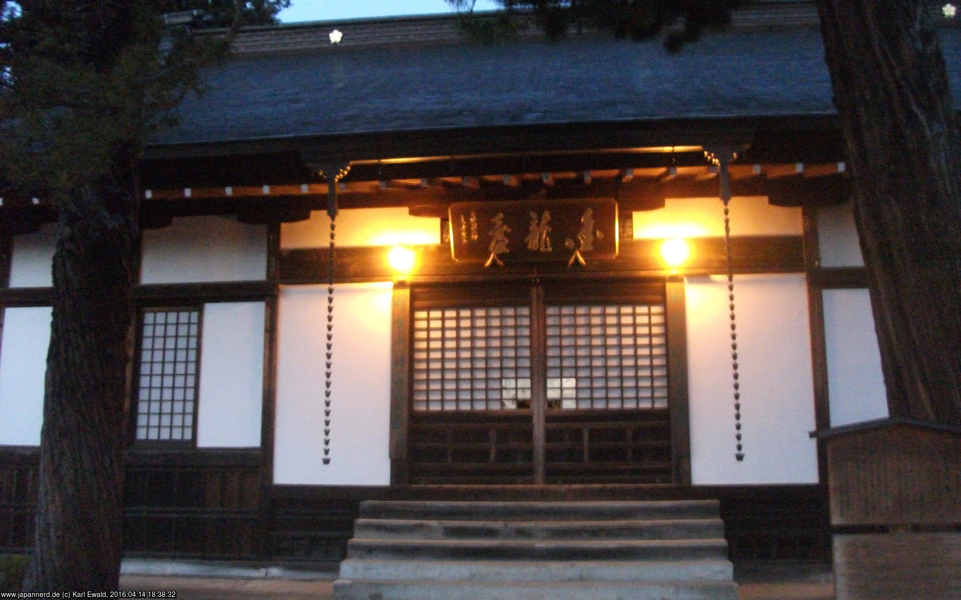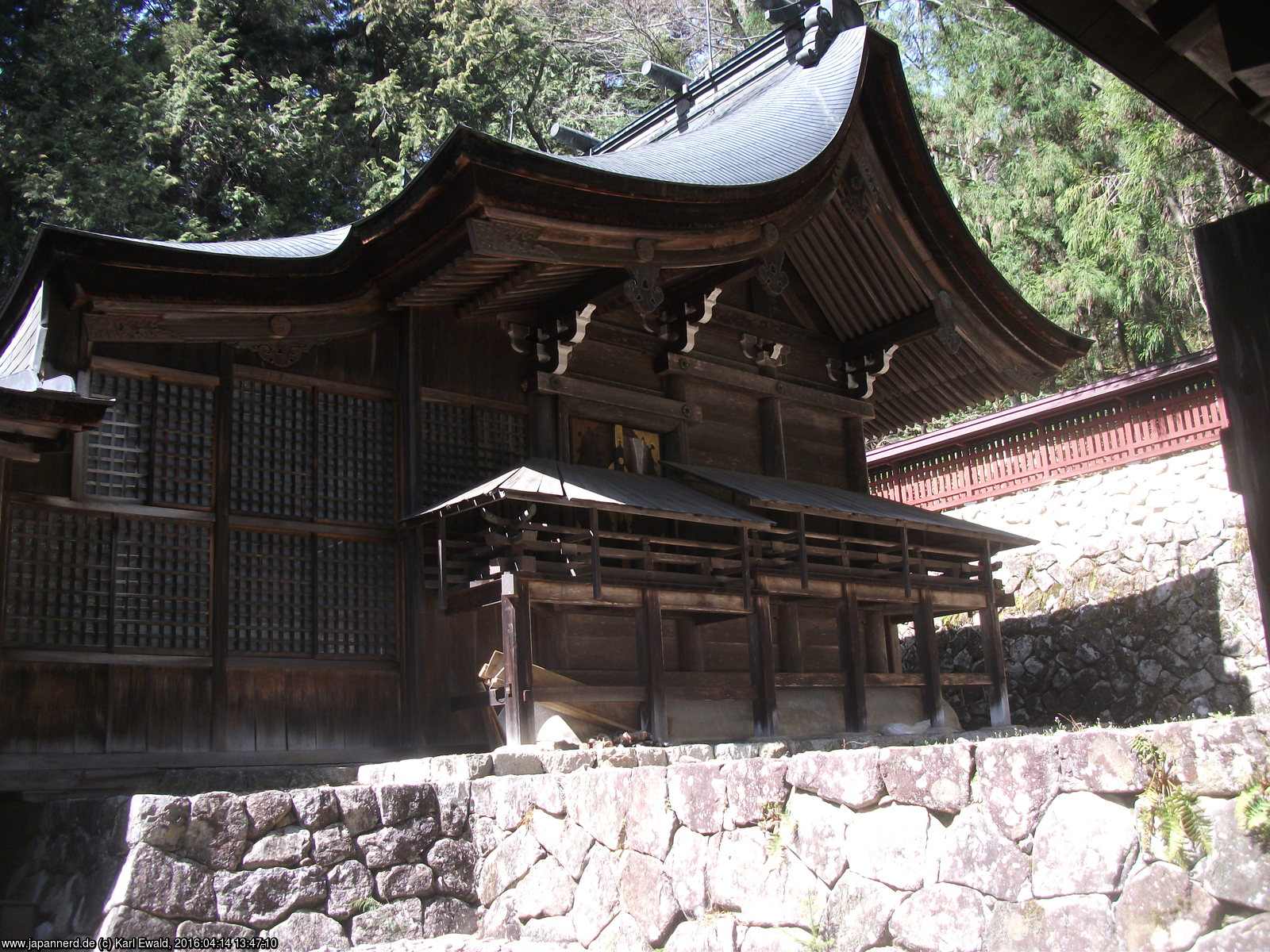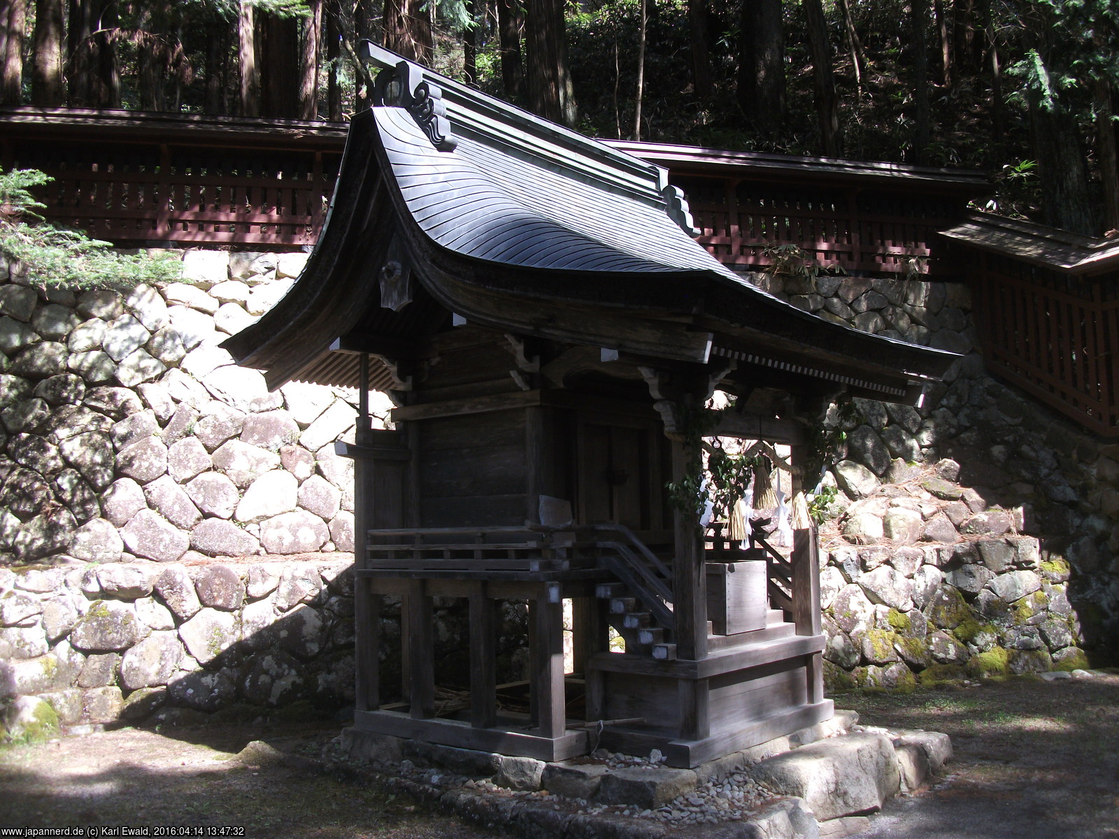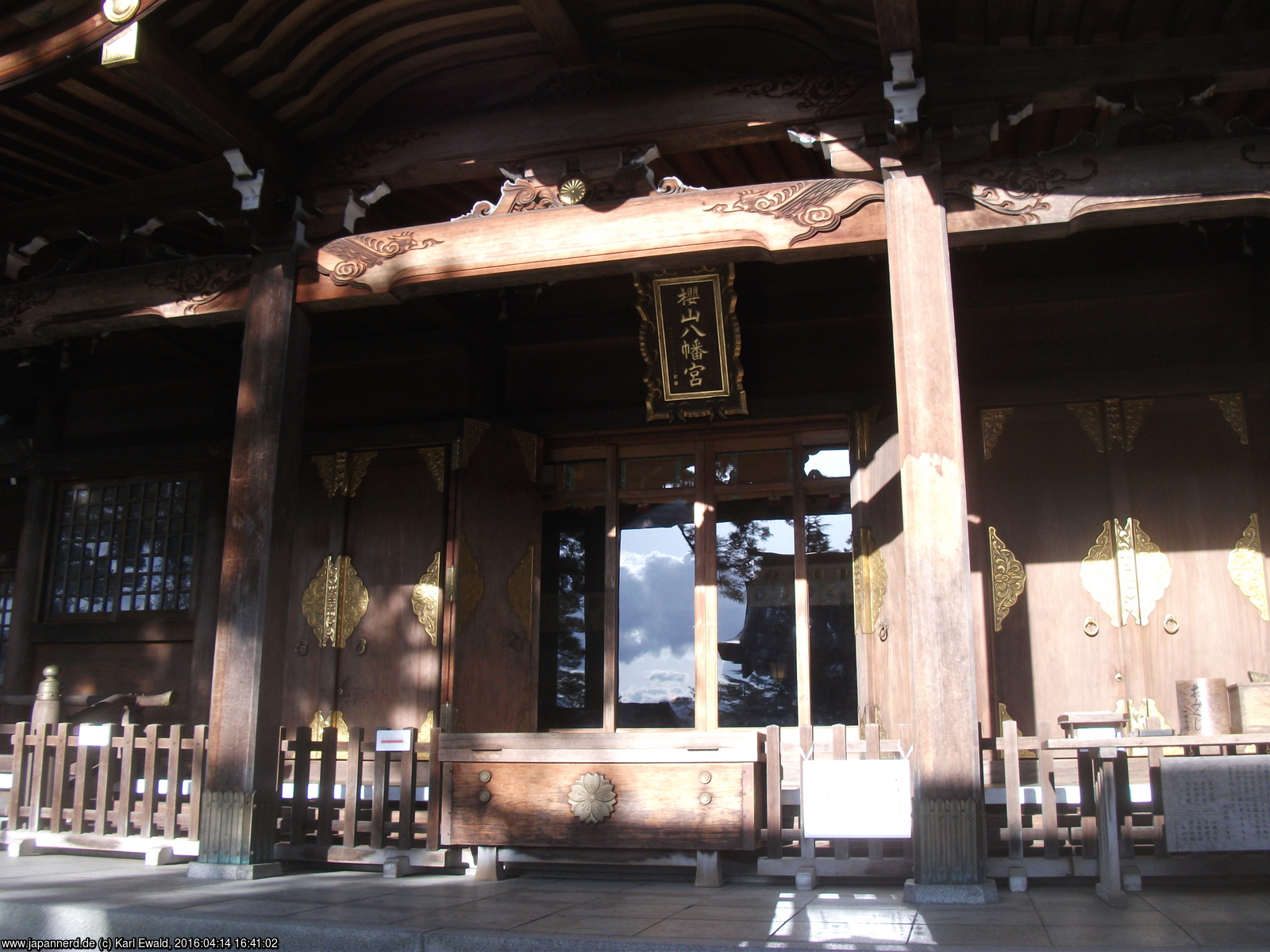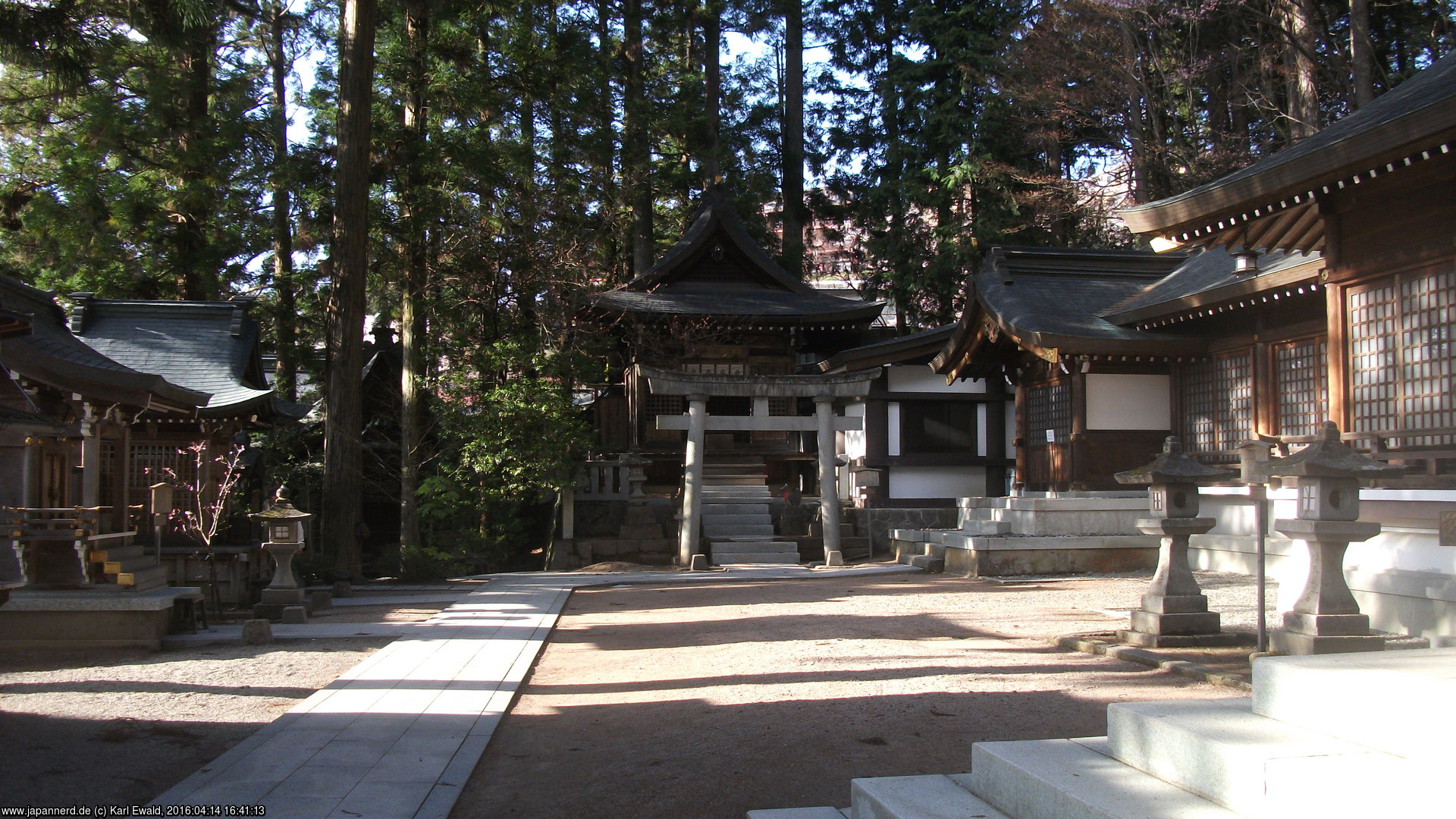 Der Zaun auf der rechten Seite gewährt einen Blick auf die typische Anordnung eines Schreins: hinter der Bethalle (Haiden) folgt zunächst ein Aufgang, in dem Opfergaben dargebracht werden, und ganz hinten weiter erhöht der Honden, der Sitz des Kami, der auch von Priestern nur zu bestimmten Ritualen betreten wird.