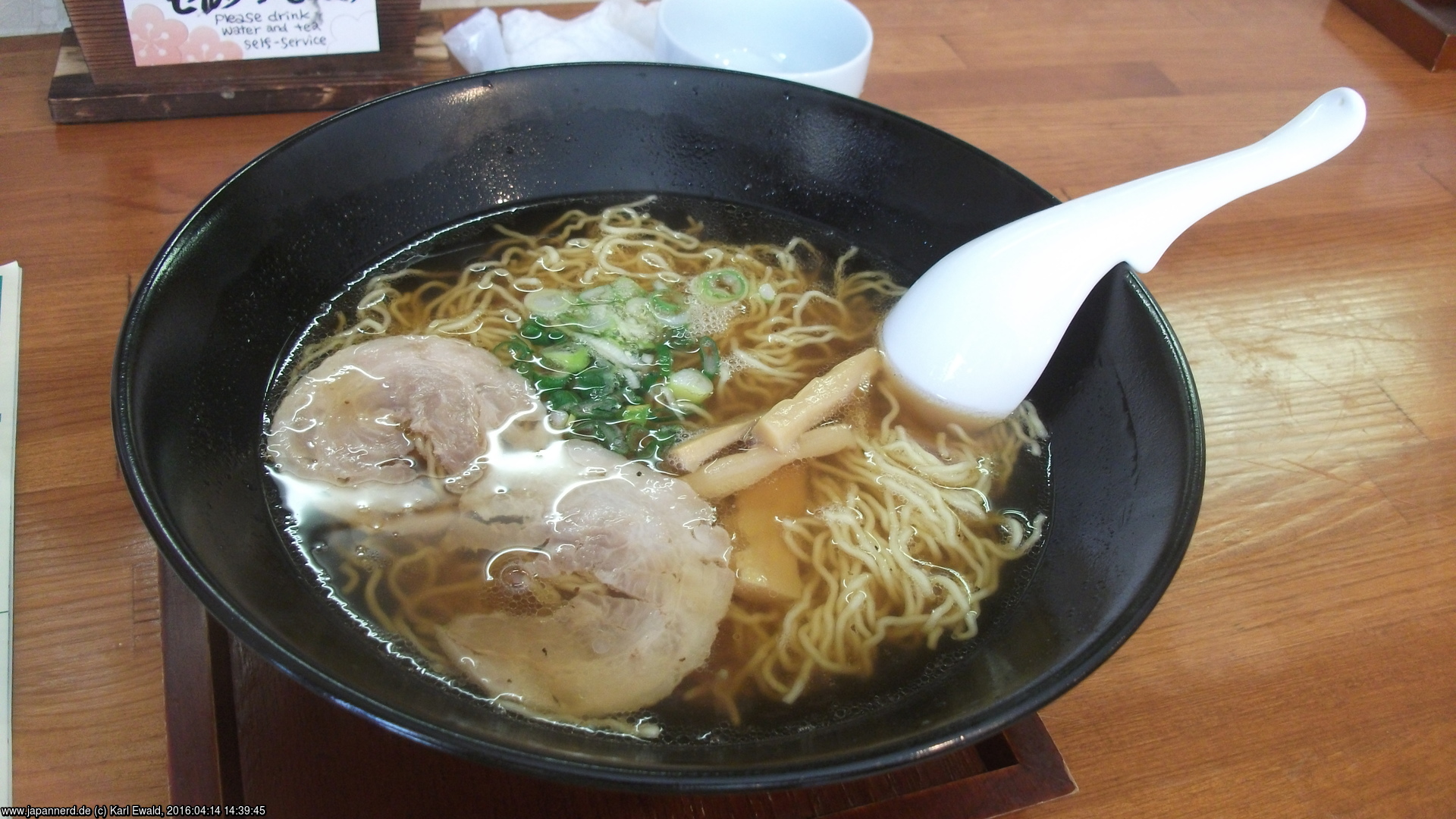 Inzwischen habe ich Hunger. In einer kleinen Wirtschaft bestelle ich “Takayama Ramen”, die laut Erläuterung durch eine einfache Suppe auf Sojasoßenbasis gekennzeichnet sind. Lecker!