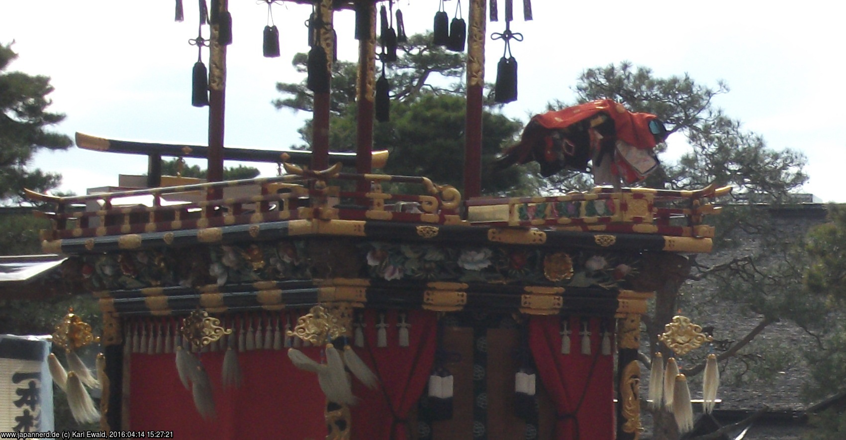 Jenseits der Brücke sind weitere acht Festwagen auf dem Straße zum Schrein aufgereiht. Nicht nur die Vorderseite, auch die Rückseite, die bei vielen Wagen mit einem Hängebild verziert ist, und natürlich die Seiten sind faszinierend. Jeder einzelne Wagen vereinigt Kunstschreinerei, Schnitzerei, Malerei, Stickerei und Knüpfkunst, Metallarbeiten für die Beschläge, Vergoldung und vermutlich weitere Disziplinen zu einem Gesamtkunstwerk.