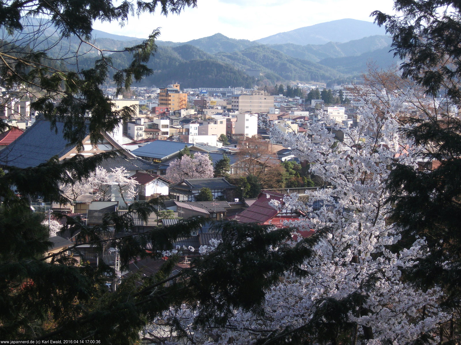 Blick auf das östliche Takayama mit blühenden Kirschbäumen