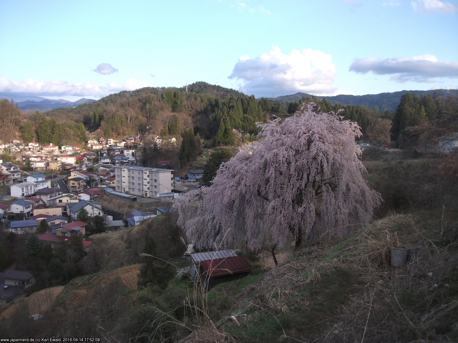 Takayama, blühender Trauer-Kirschbaum über der Stadt