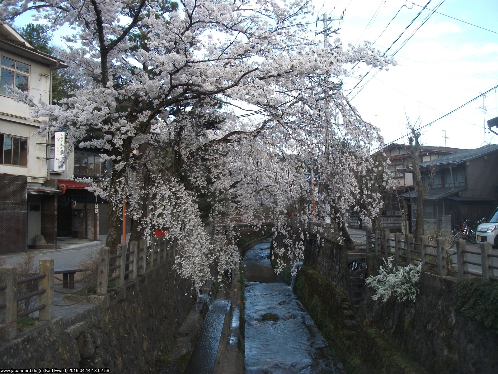 Vom Schrein wende ich mich wieder zurück in die Stadt. Takayama wird von einem kleinen Fluss durchzogen, an dessen Ufer natürlich Kirschbäume gepflanzt sind. Wie gesagt führt die Höhenlage dazu, dass die Kirschen hier etwa eine Woche später dran sind als in den Küstenstädten und daher in voller Blüte stehen.