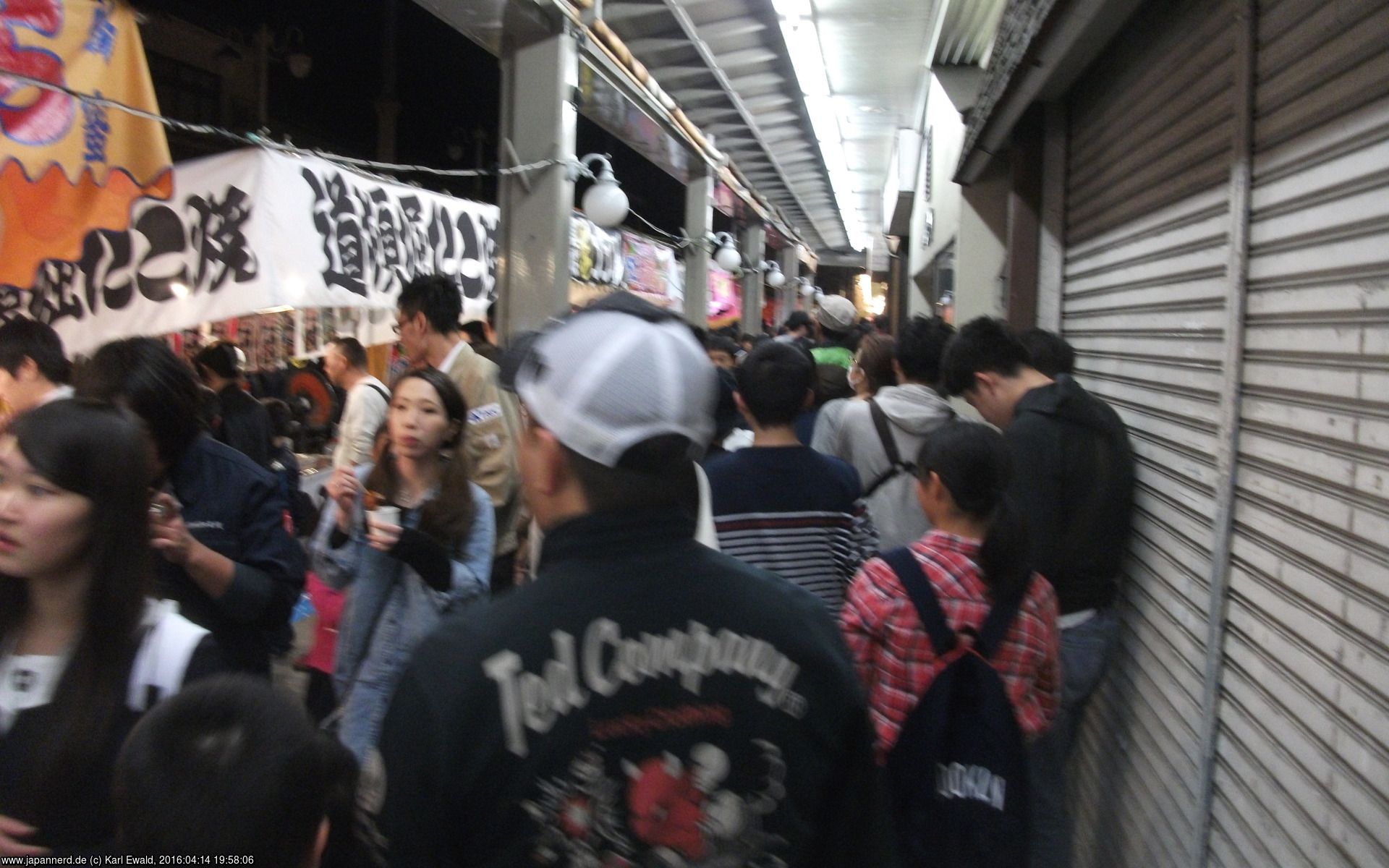 Einzig der Weg zum Bahnhof war etwas länger. Die Brücke, über die die Festwagen fahren, war auch für Fußgänger gesperrt, man musste also zur nächsten Brücke ausweichen. Auf der anderen Seite traf ich auf die Matsuri-Budenstraße. Hier war es enger als an der Paraderoute.