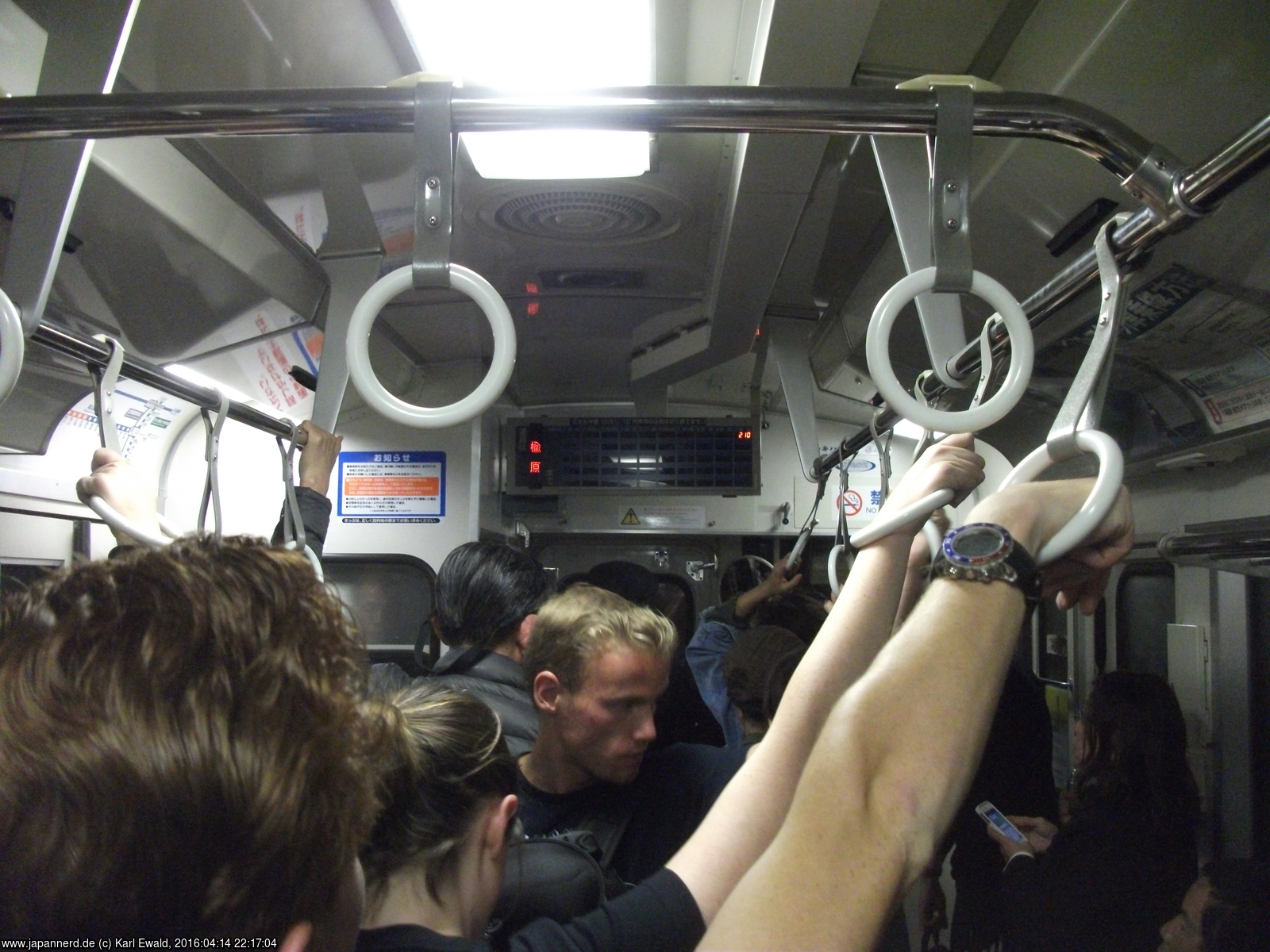 Was ich vorher nicht recherchiert hatte: der Limited Express Hida fährt nur tagsüber, die letzte Fahrt war um 17:15. So blieb nur der Local Train mit Umstieg in Inotani mit zwei Fahrten mit Toyama um 17:50 und 20:50. Wie zum Hohn kam gegen 20:20 ein Hida Limited Express von Süden an, der aber in Takayama endet. Erst danach wurde die Warteschlange auf den Bahnsteig gelassen. Immerhin für die ersten 68 Minuten nach Inotani bekam ich noch einen Sitzplatz, beim Umsteigen waren mir die Ortskundigen überlegen, die den Anschlusszug nicht erst finden mussten, also war für diese weiteren 48 Minuten Stehen angesagt.