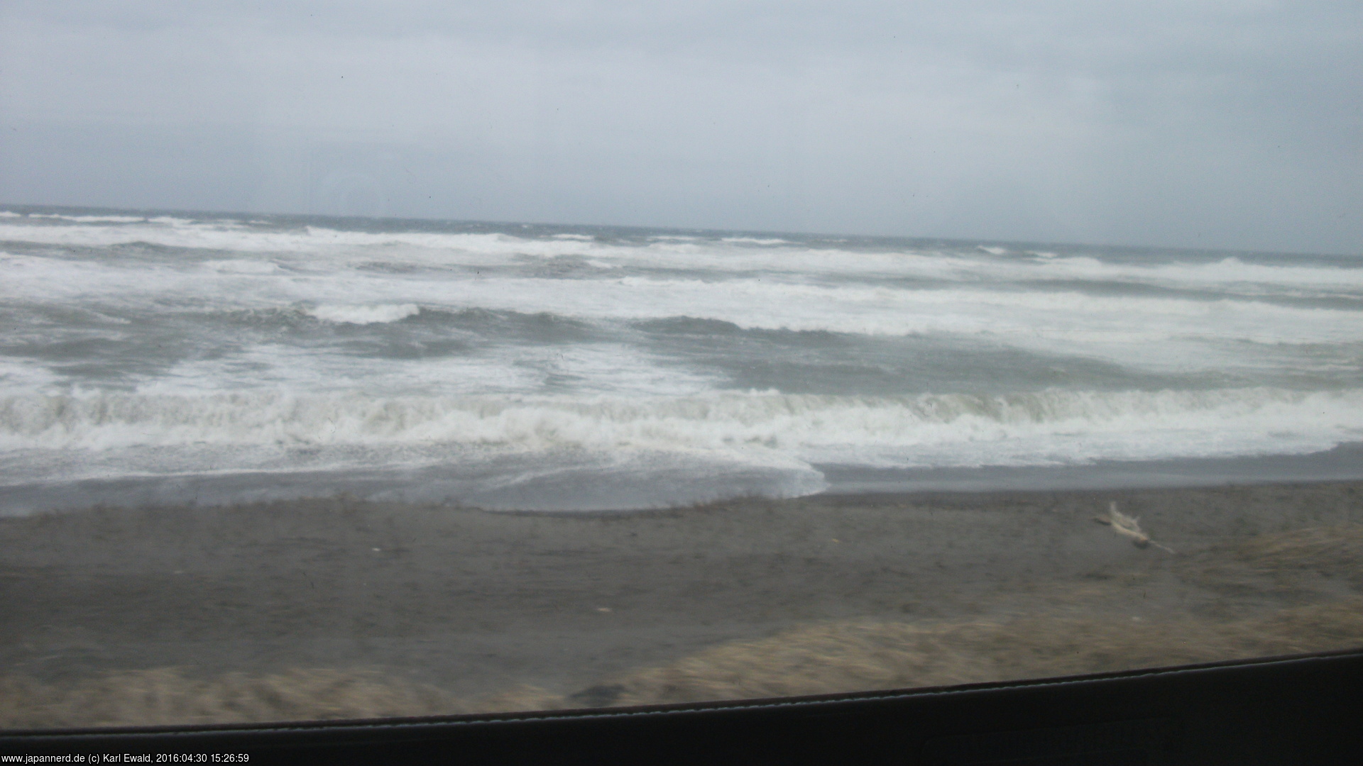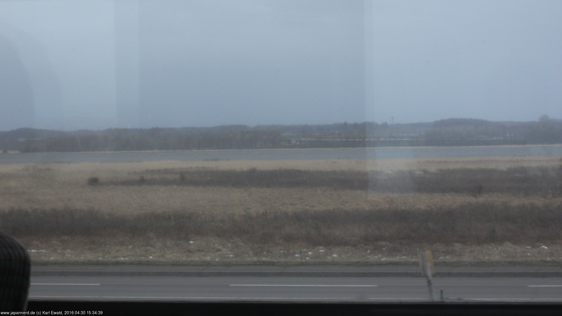 Streckenweise ist auch rechts Wasser zu sehen, wir fahren einige Kilometer lang auf einem breiteren Damm zwischen dem Meer links und den Tofutsu-See rechts.