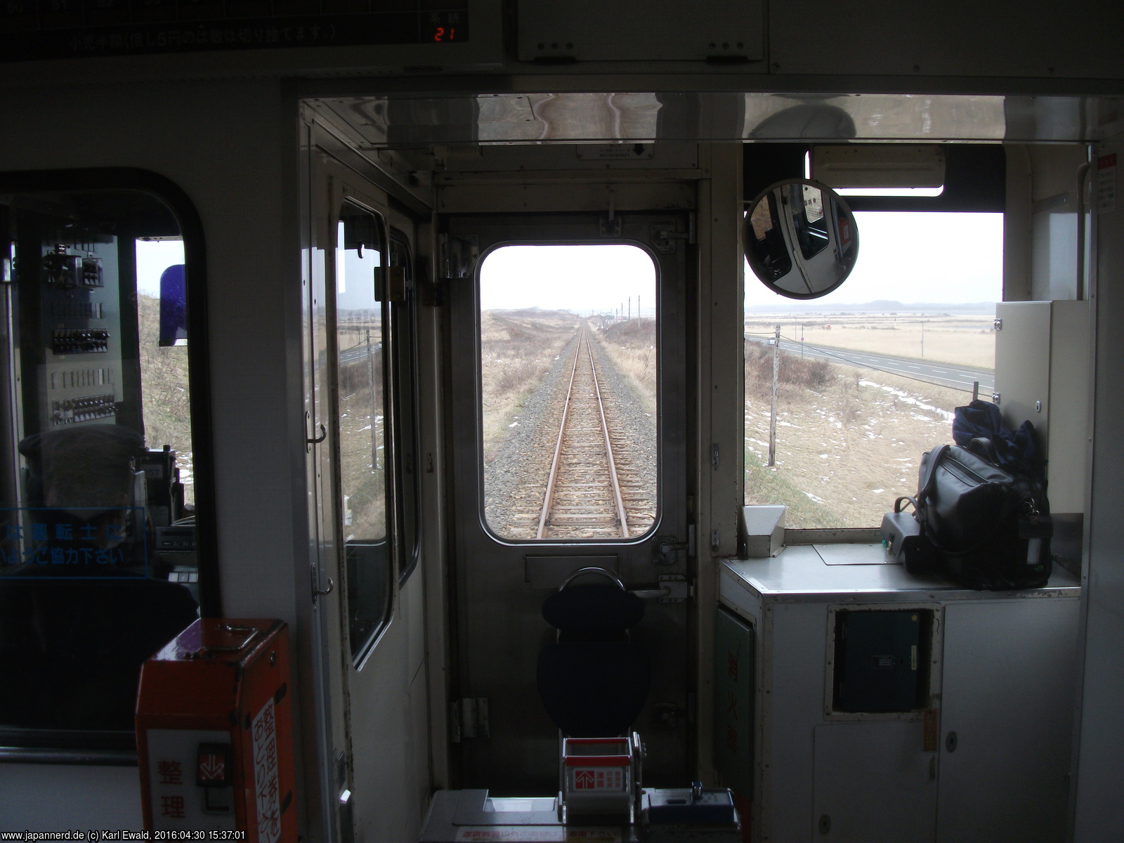 Bis Abashiri konnte ich den Limited Express nutzen, danach wurde es ländlich, der “One Man Car” ワンマン, wo der Fahrer gleichzeitig Schaffner ist, und bei kleineren Bahnhöfen an der einzig geöffneten ersten Tür die aussteigenden Leute abkassiert, führt einen einzelnen Dieseltriebwagen KiHa 54 über das eine Gleis an der Küste entlang.