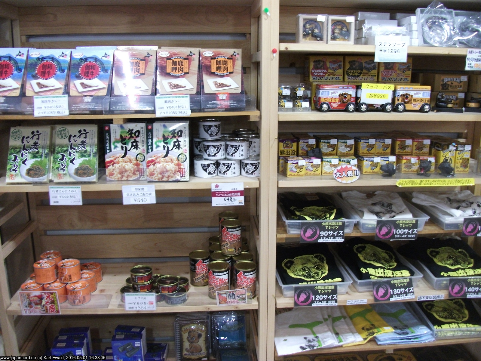 Shiretoko Goko: im Shop gibt es neben diversen Souvenirs auch Konserven (links) mit Hirsch- und Braunbärfleisch.