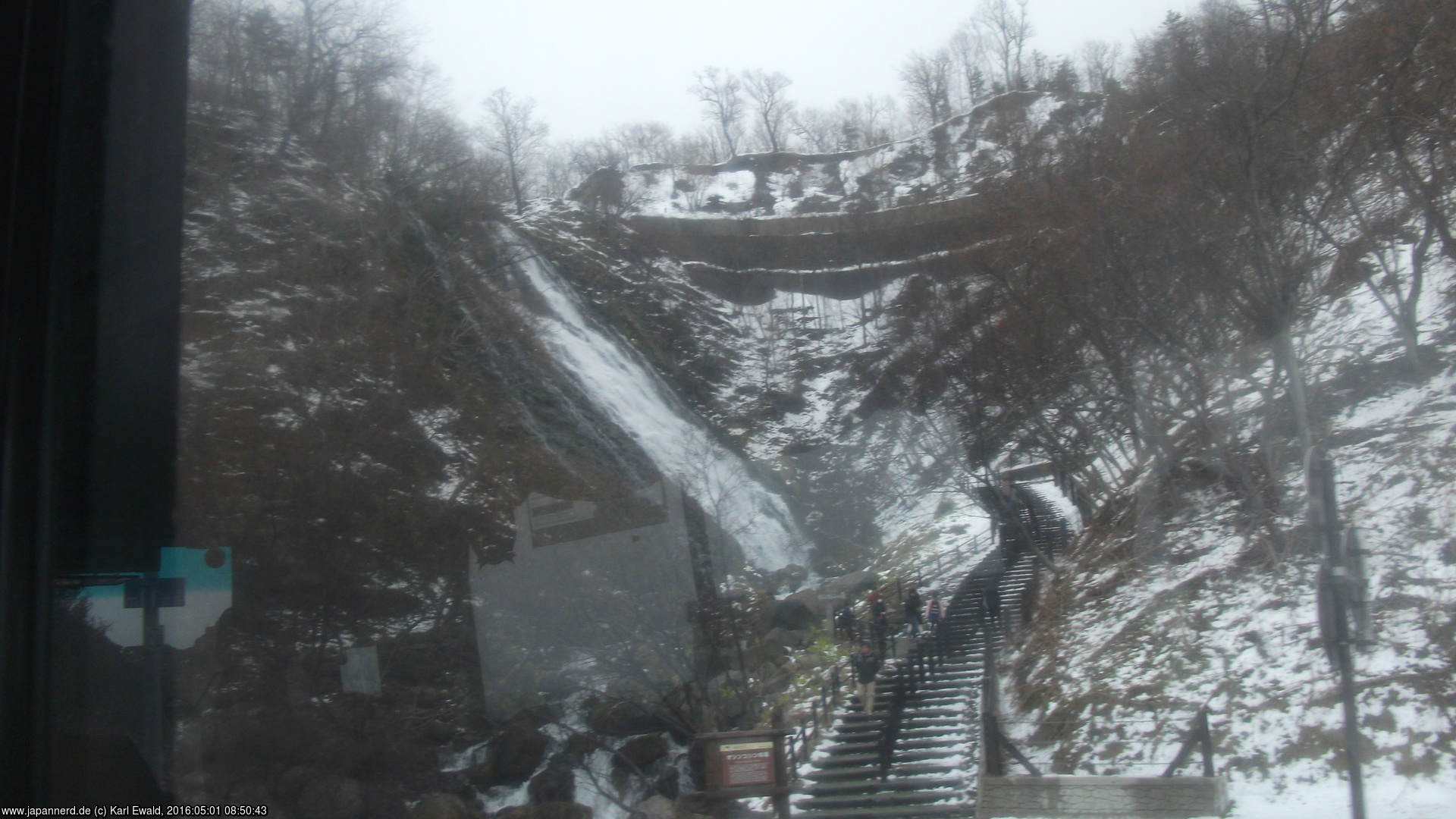 Der Busfahrer spielt ein wenig Fremdenführer, verlangsamt seine Fahrt bei Sehenswürdigkeiten oder hält gar mal kurz an. Vor Utoro passieren wir die Oshinkoshin Wasserfälle. Sie stürzen links schräg am Hang herunter, daneben gibt es Treppen zur Nahbesichtigung. Nett wäre es schon, hier auszusteigen und die Wasserfälle aus der Nähe zu sehen. Aber der nächste Linienbus fährt in drei Stunden, also muss ein Foto durchs Busfenster genügen.