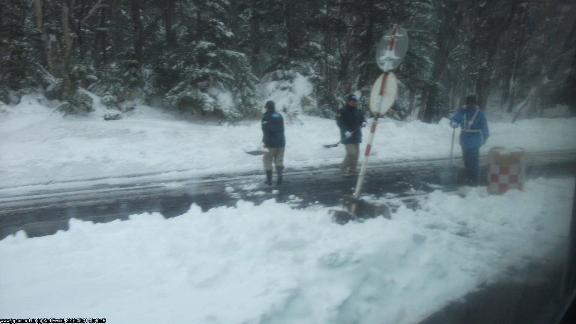 Am Parkplatz der Fünf Seen sind die Männer noch mit Schneeräumen beschäftigt. Sowohl die Straße über den Shiretoko-Pass nach Rausu als auch der Schotterweg von hier zu den Kamuiwakka Warmwasserfällen sind noch gesperrt.